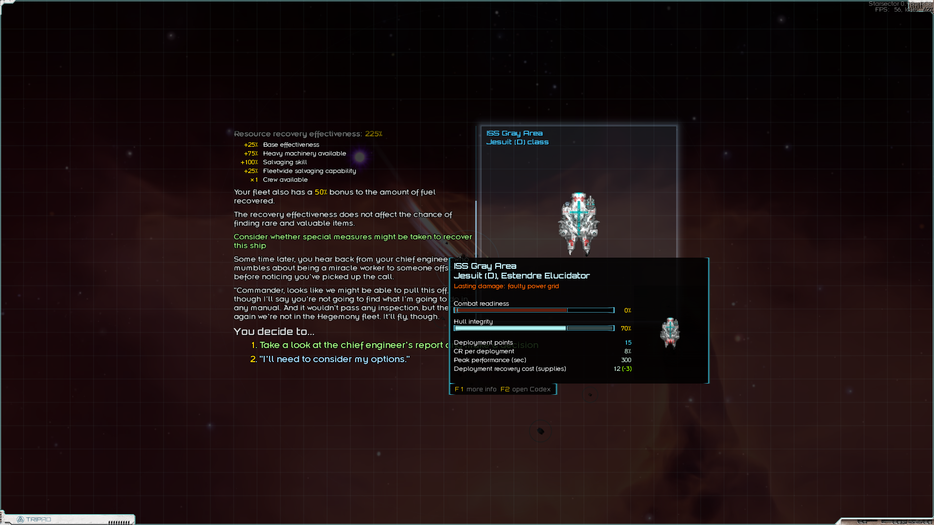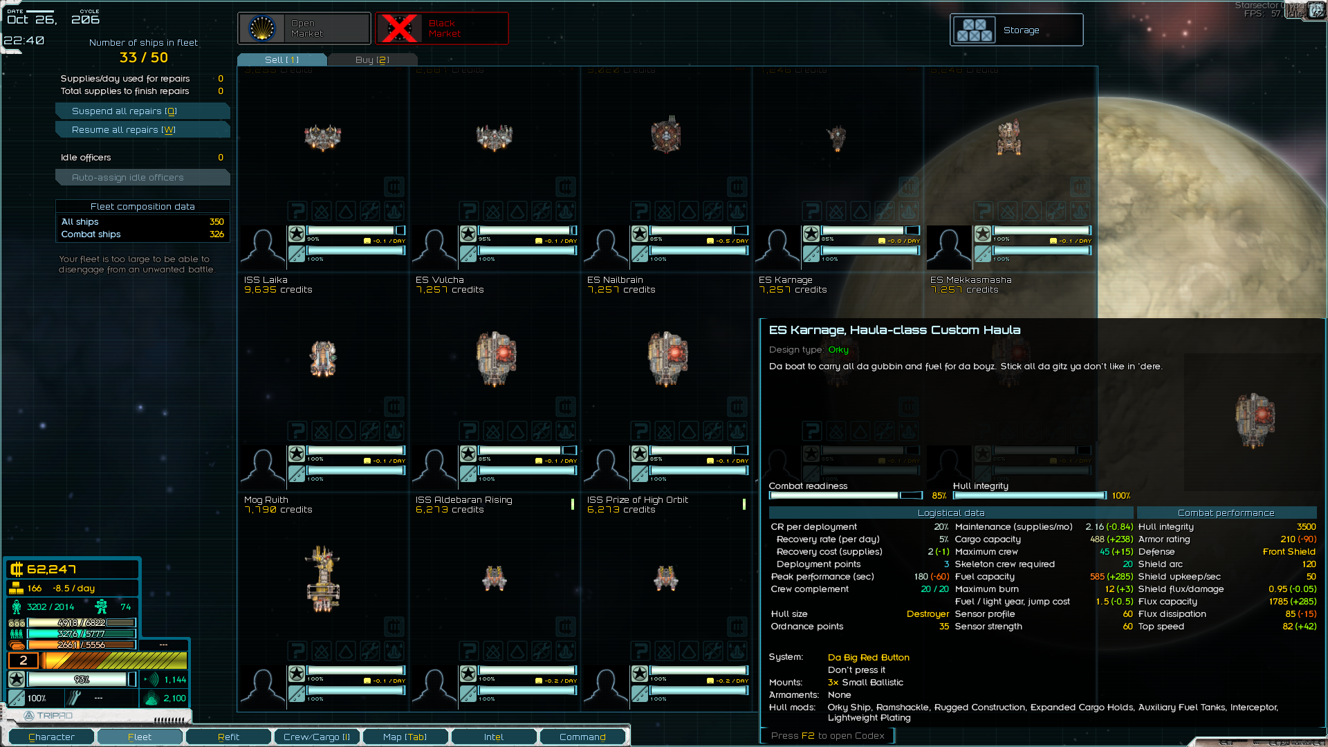 Пиратские корабли это обычно спизженные и хуево переделанные нормальные корабли, хотя и среди них есть неплохие варианты вроде пиратского фалькона. > 2. Имеет смысл восстанавливать какие-то корабли в доках? Оч дорого выходит. Имеет смысл взять талант на автоматическое восстановление кораблей за нихуя в жёлтой ветке и потом респекнуться из него, когда восстановишь всё необходимое. > Я так понял, там больше ресурсов будет на содержание тратиться для отремонтированных. Вроде бы для этого нужен талант из желтой ветки, если мне не изменяет память. Я просто в ёрли гейме никогда без неё не играю. Без этого таланта вроде однохуйственно. > И тут вообще новые корабли продаются, или все варенные-переваренные? Качество кораблей зависит от того какого качества корабли может делать фракция. Например у гегемонии и персидской лиги есть качественная нанофорджа и поэтому они могут делать корабли с 0-1 Д модами, но обычно они не продают просто так на открытом рынке и ты можешь купить их либо на военном рынке, для чего нужно быть их шохой, либо на чёрном рынке. но всё же иногда бывает что и на открытый рынок вбрасывается что-то годное. Нужно мониторить. Но отвечая на твой вопрос - да, можно купить новый или почти новый корабль. > 3. Чем чреваты покупки на чёрном рынке если товар не контрафактный для фракции? Меня спалят, что я на чёрном рынке колбасой закупился и репутация упадёт, или чё? Будут патрули останавливать и шмонать, что тратит припасы по итогу и утяжелает задачу контрабанды. Т.е. если ты не планируешь регулярно контрабандить в систему, то в принципе можно и на чёрном рынке купить на похуях, а припасы от шмона ну это такое. > По кораблям Не особо. Старсектор весьма балансная игра и практически всё играбельно. Но разные кораблики требуют разного скилла и подхода. Если на том же онслоте вполне можно нормально летать не умея играть вообще, то на одиссеии это будет верной смертью. Несмотря на то что оба корабли в S тире.