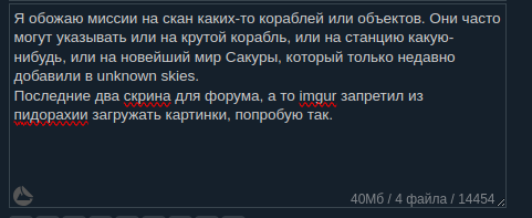 Короче збс старт, главное тебе чтобы какой-нибудь модовский баг мне всё не обосрал. Или я не слил корабли на хуйне, ибо хоть и играю не на айронмене, но остальные сейвы мне нужны на случай подлянок от модов, после проёба загружаться не буду. >>49810911 Братишка, просто принтскрин нажми, игра сама скриншот делает. >>49811262 Несколько крузёров уже могут развалить пирратскую или луддитскую базу, пара линкоров - вообще любую. Если проблемы - советую попробовать пираньи массово. Волна их бомб при достаточном кол-ве разуплотняет любую станцию за несколько заходов, несмотря на щиты. Хотя их желательно напрячь всё же. Только осторожно с минами и вражескими файтерами, желательно чтобы у пары авианосцев была заточка на истребители какие-нибудь. Только не миксуй их с пиратньями на одном корабле. Алсо если повезёт/навостришься, бомбы пираний на диво хорошо чистят вражеские файтеры, если они попали между бомбардировщиками и целью.