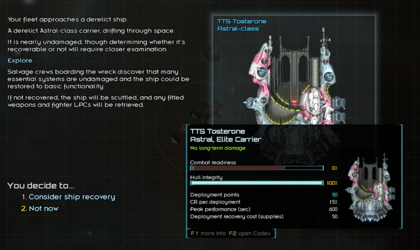 >>49852861 Хз о чём вы спорите, но ради справедливости надо скозать, что в старсекторе имеет смысл рашить сюжетку чтобы получить девайс ануса и возвращаться в кор через врата. А сюжетка рашиться с минимальными вложениями ибо почти вся проходится по стелсу, а там где скриптовый перехват и налёт - юзается сторипоинт для дисэнгейджа. Для открытия врат ануса у тебя нет ни одного обязательного боя. Поэтому вся логистика обычно сводится к тому чтобы весь хлам дотащить до ближайших врат, а не пердолиться по всей голактеке. Поэтому значимость топлива в разы меньше, чем значимость карго.