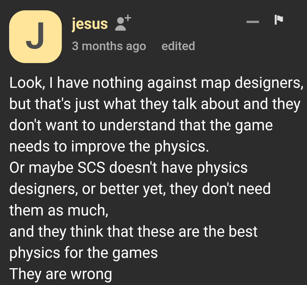 Давайте постить сюда свои беливы, я начну: Когда-нибудь сцсхуйвэр завезёт настоящие звуки движков и коробок Когда-нибудь сцсхуйвэр завезёт реальные обороты и крутящие моменты Когда-нибудь сцсхуйвэр зделоет водителей твоей компании реальными нпц с реальными маршрутами