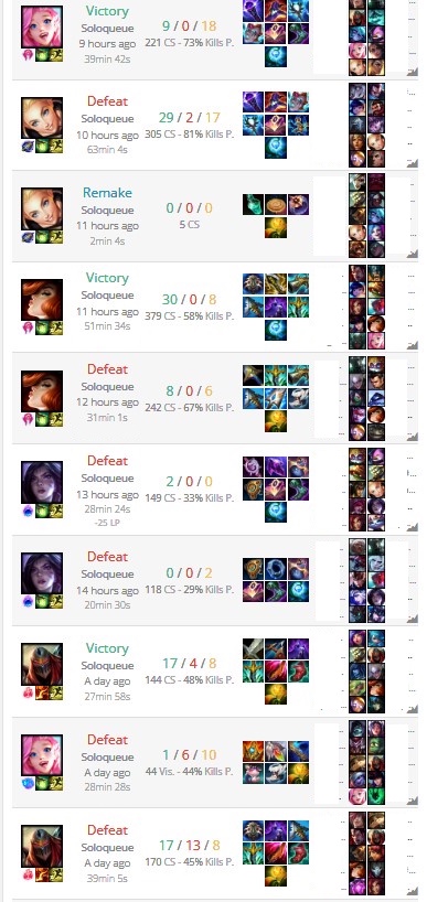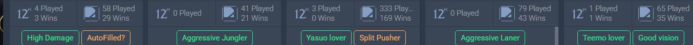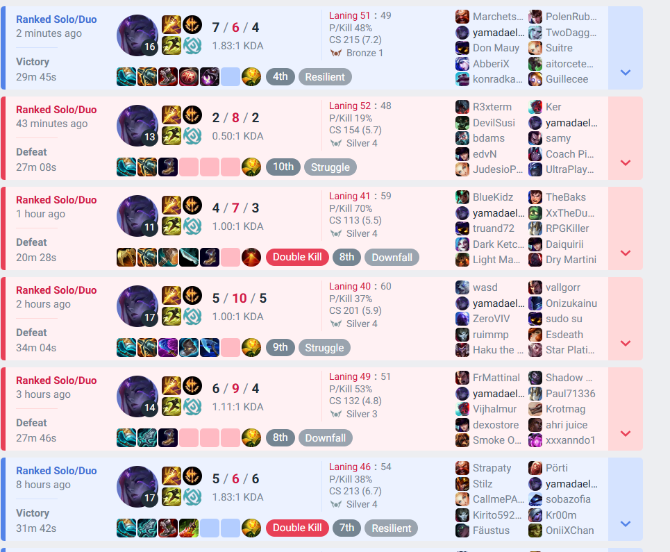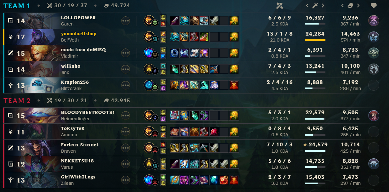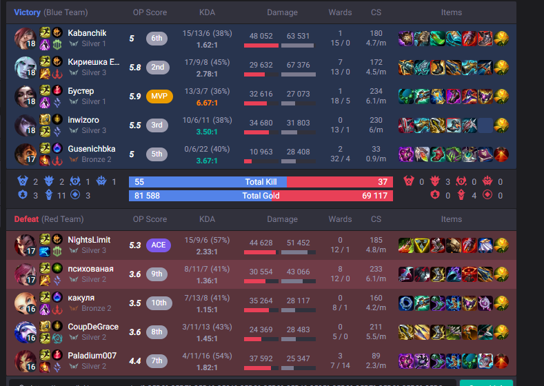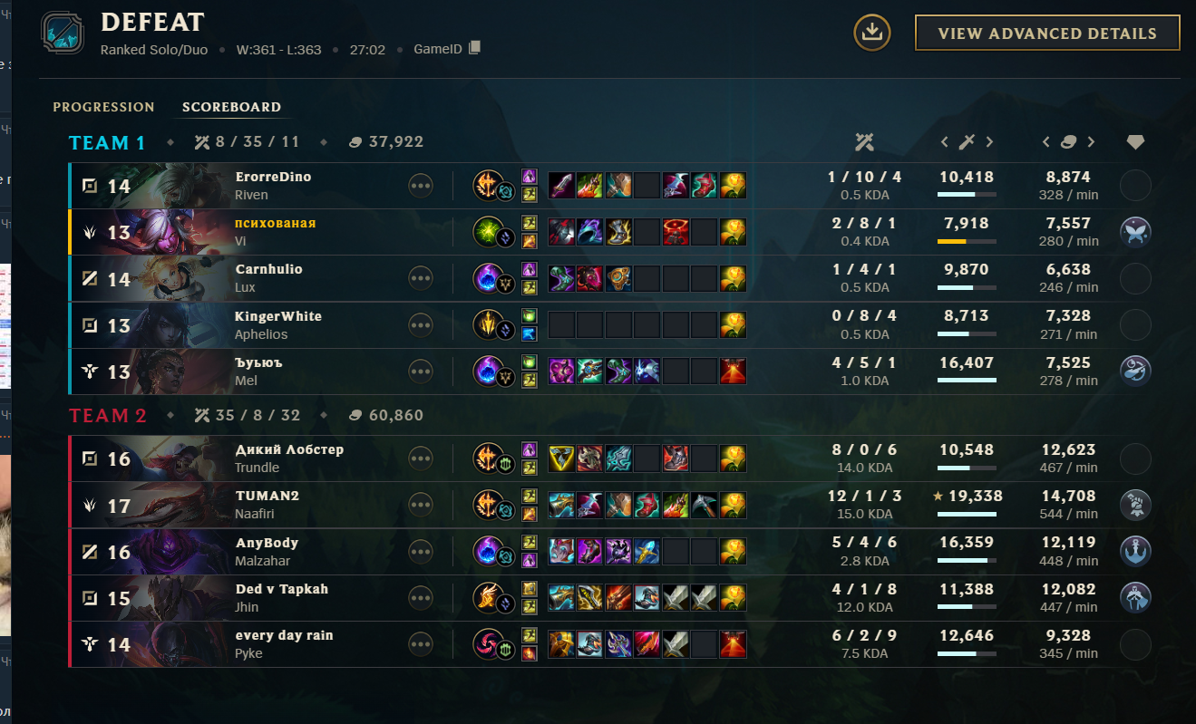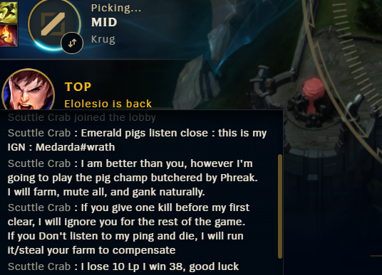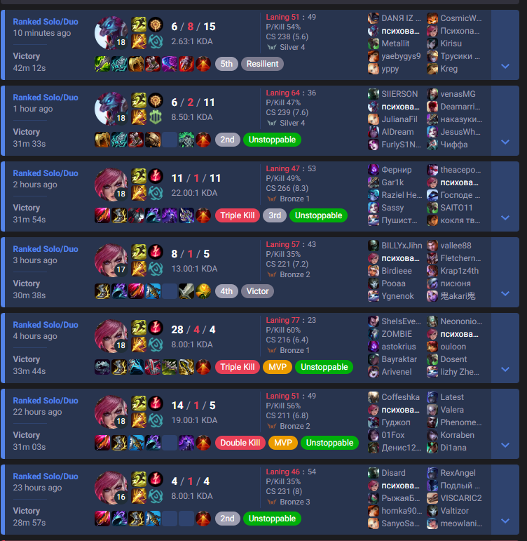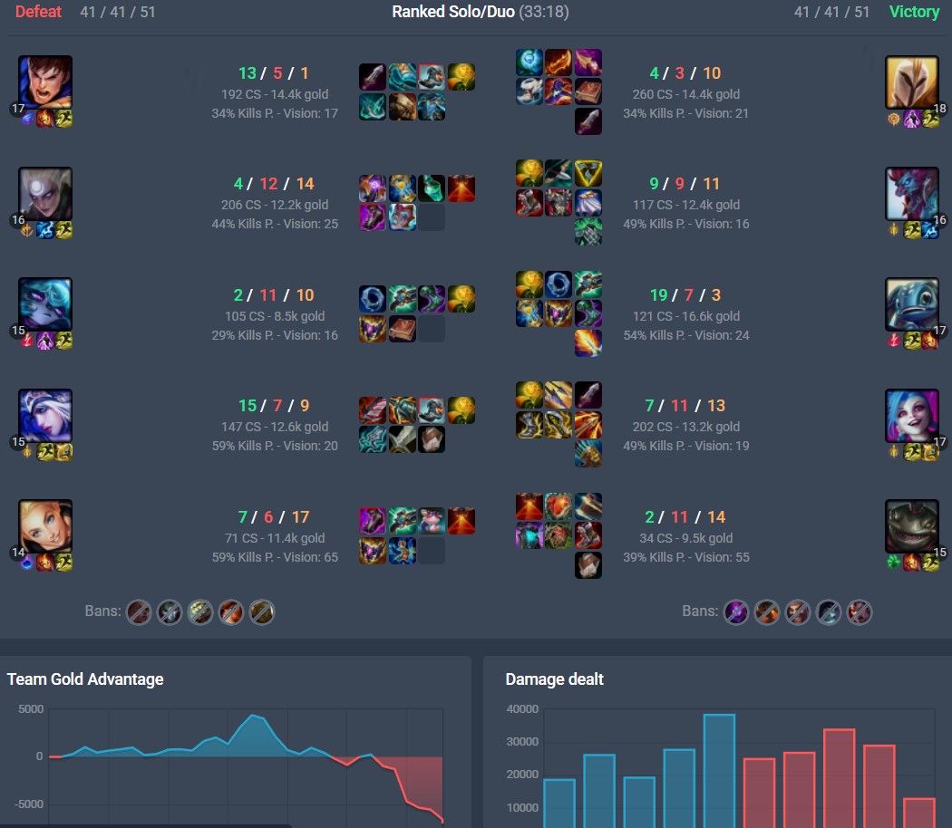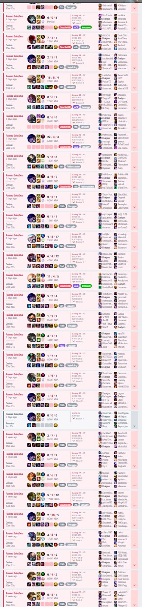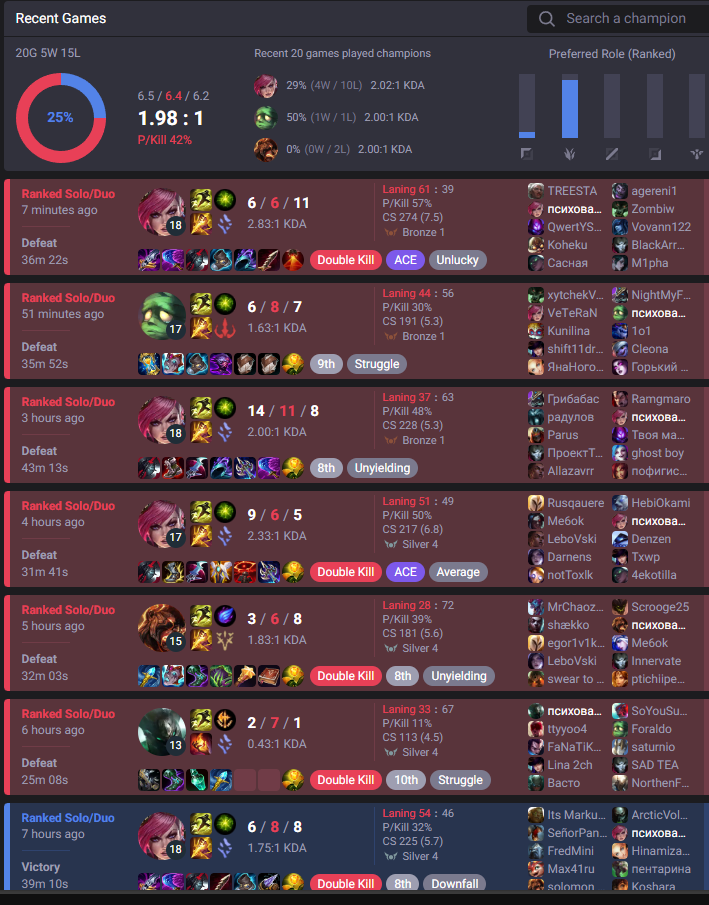 https://op.gg/lol/summoners/euw/Evelynn-Heku Нужен анализ и версии происходящего с моим "тиммейтом". Ведь подкрутки и подкидывания плохих тиммейтов не существует. Ну, типа данного "человека" бустанули 2 недели назад до платки4 (у него десяток побед подряд, почти везде MVP на паре-тройке чемпиков, которыми впоследствии он не играл практически). Далее, чел лузает 1 игру, выигрывает 1, лузает 10, выигрывает 1, лузает 42 подряд (СОРОК ДВЕ) подряд и далее в таком же темпе, 1 вин, 5-6-7-10 лузов подряд прямиком с платки4 до железа4 0лп. У меня этот пчелибос попался какое-то время назад в качестве "лесника". На нейтральную просьбу, мол, какого хуя сидит в лесу, пока вражеский лесник жизни не дает, и соизволит ли мистер припиздовать хотя бы раз на ганк или хотя бы попытается взять обьект. Ну, чел, видимо, бахнул, потому что высветился в чате "селф-мут" и пошла усиленная долбежка лесных кемпов с забиранием лейн крипов и добиванием телег смайтом.