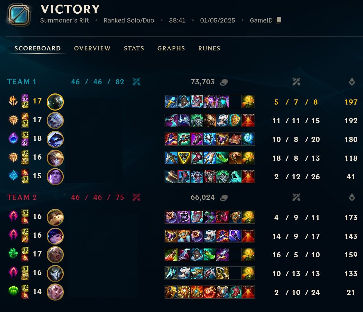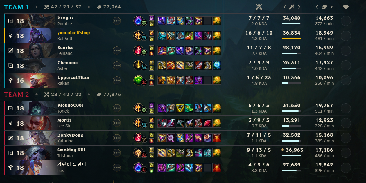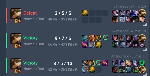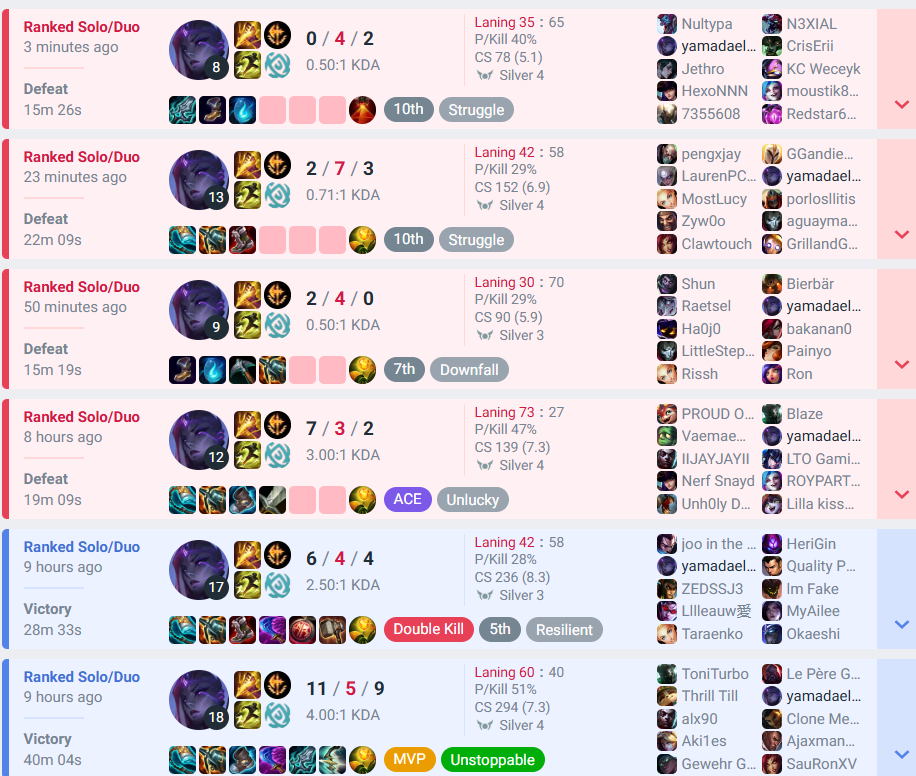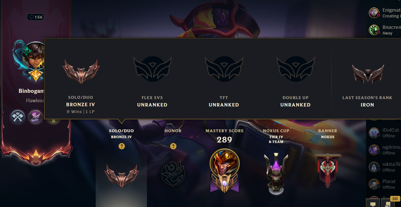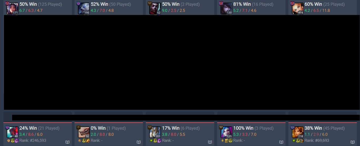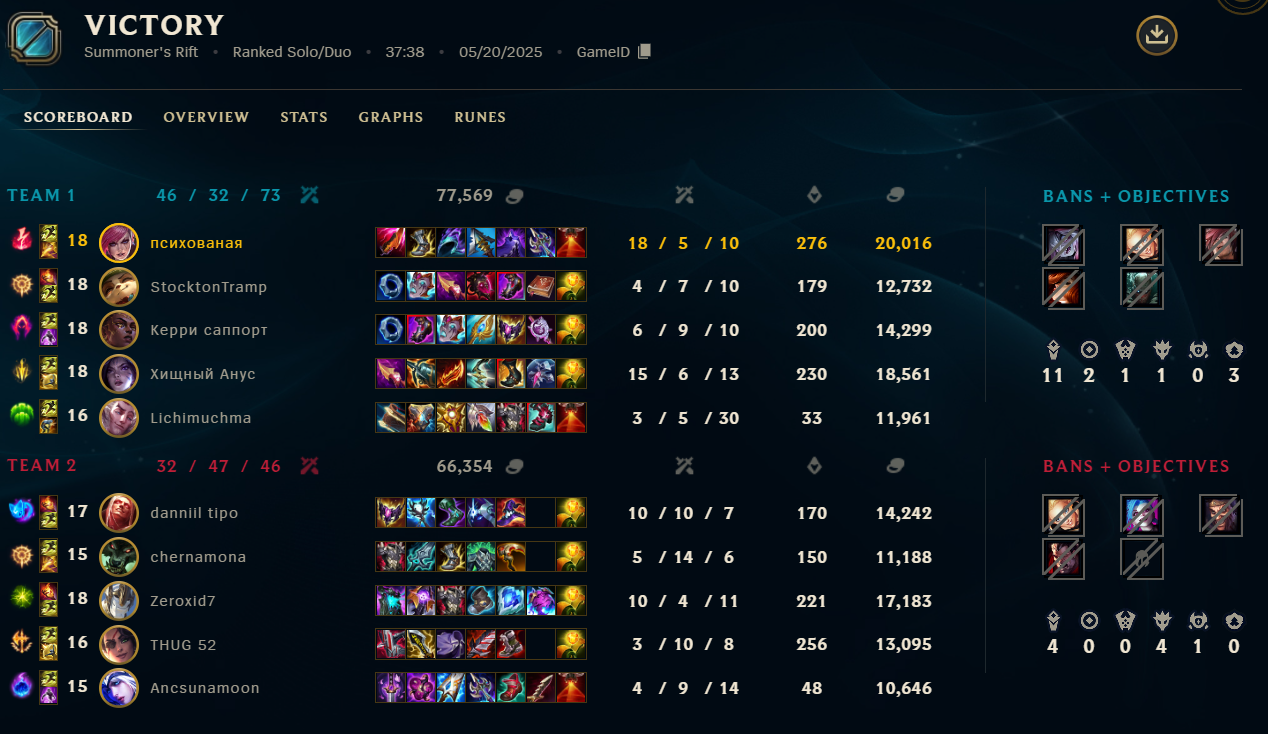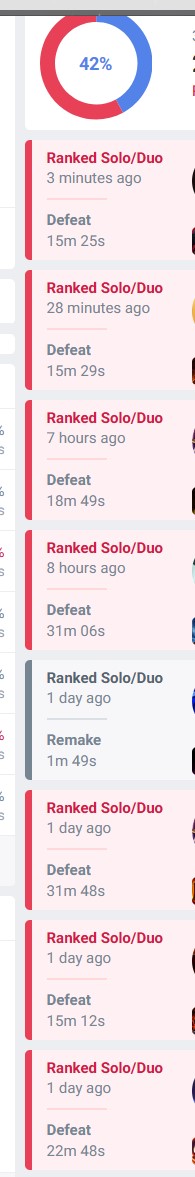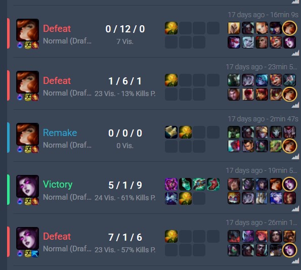 https://op.gg/lol/summoners/euw/Evelynn-Heku Нужен анализ и версии происходящего с моим "тиммейтом". Ведь подкрутки и подкидывания плохих тиммейтов не существует. Ну, типа данного "человека" бустанули 2 недели назад до платки4 (у него десяток побед подряд, почти везде MVP на паре-тройке чемпиков, которыми впоследствии он не играл практически). Далее, чел лузает 1 игру, выигрывает 1, лузает 10, выигрывает 1, лузает 42 подряд (СОРОК ДВЕ) подряд и далее в таком же темпе, 1 вин, 5-6-7-10 лузов подряд прямиком с платки4 до железа4 0лп. У меня этот пчелибос попался какое-то время назад в качестве "лесника". На нейтральную просьбу, мол, какого хуя сидит в лесу, пока вражеский лесник жизни не дает, и соизволит ли мистер припиздовать хотя бы раз на ганк или хотя бы попытается взять обьект. Ну, чел, видимо, бахнул, потому что высветился в чате "селф-мут" и пошла усиленная долбежка лесных кемпов с забиранием лейн крипов и добиванием телег смайтом.