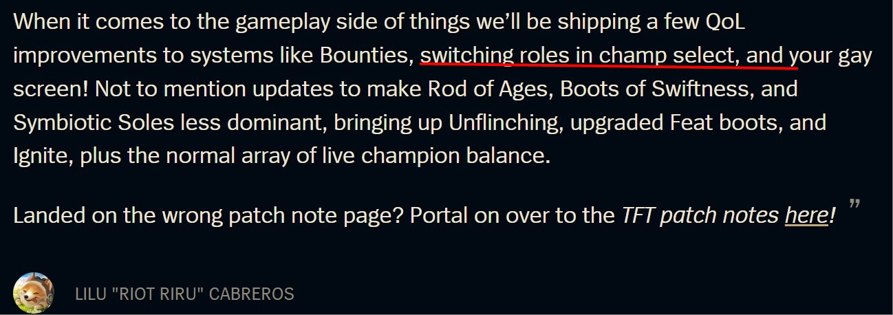 какого постинга ты хочешь ну смотри в огиже за два месяца наконец патч вышел и он как всегда крупнее всех патчей мертвейшей лишки кала за год и всем все равно похуй зачем высирать +1 -1 урона каждые две недели для отчета и видимости работы над файтингом как ритогомез если можно работать над игрой следить за нездоровыми персонажами айтемами лесныаи айтемами пассивками аспектами удалять старые добавлять новые и тасовать все раз в пару месяцев а не раз в год как рито сосу извиняюсь драсте лишкотерп терпит