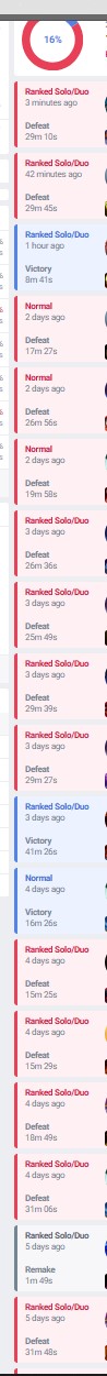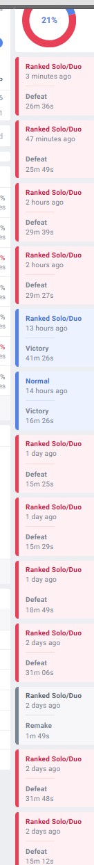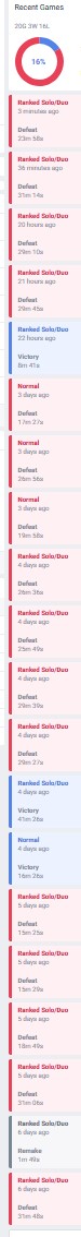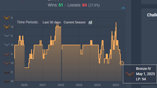 Дегенераты на разрабах вообще не понимают, что их главная задача должна быть в том, чтобы балансировать команды так, чтобы набор сил был равным и команды чувствовали, что их ждёт равная честная битва. Но из раза в раз хуяришься против 90%+ вр смурфов, имея в команде 30-40% винрейт челов, которые запускают ранкед под сиську пива, их абсолютно устраивает их текущее эло и им до пизды, проиграют они сейчас или выиграют. Они просто нажали кнопку Старт и плывут по течению жизни