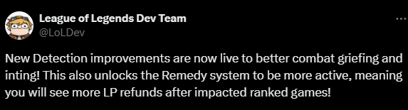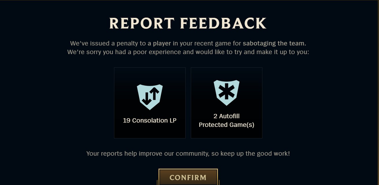 Переделка и переделка системы позволят нам: - Постоянно итерировать и создавать все больше и больше обнаружений с течением времени (есть некоторые вещи, которые мы не обнаруживаем сегодня) -> просто дайте нам немного времени, чтобы это разработать - Сделать наши наказания более суровыми (сейчас мы находимся в режиме «убедиться, что нет ложных срабатываний») - Быстро возвращать LP людям в играх, где их загриферили - Показывать отзыв репортера, когда людей наказывают (и в будущем показывать, что система работает, идентифицируя виновника на экране в конце игры) - Получать своевременные отмены поддержки игроков, когда мы ошибаемся