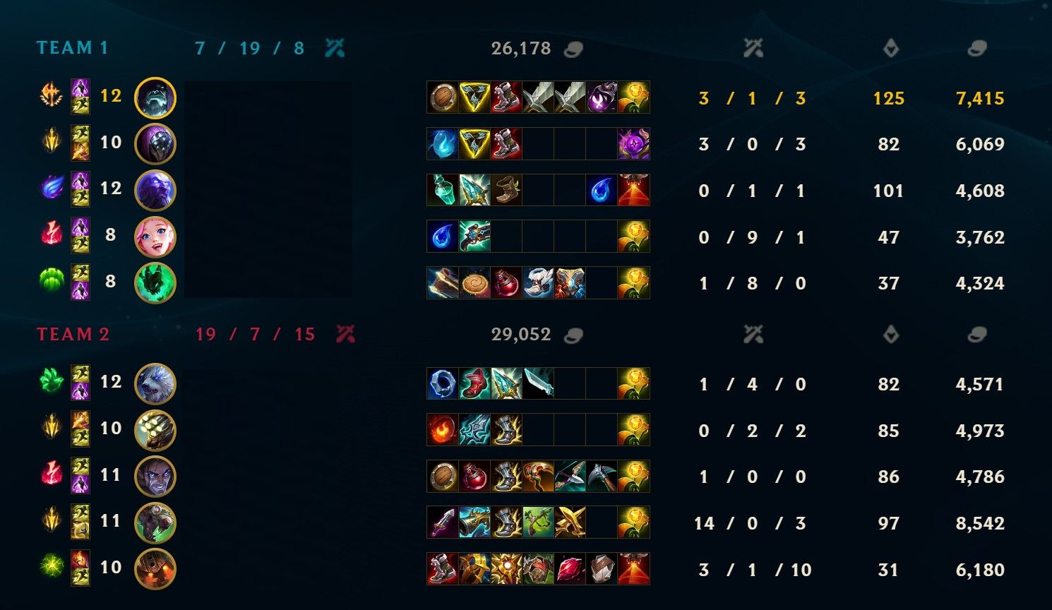 5 нормальных ранкедов дали скатать в начале недели, я даже подумал, что подбор игроков улучшили и можно вернуться, а потом как отрезало нахуй, вантрикпони дегенераты с 1,5 миллиона очков, который в слепую идут по тавер врага и фидят до счёта 1/9 и потом флеймят команду. У врагов стабильно дуо смурфы с 31 уровнем аккаунта, которые вместе идеально отыгрывают, инвейдят лес вместе, ганкают и доводят оппонентов до психоза и фф15, соло смурфы 31 уровня с винрейтом 90%, которые заканчивают с 20 киллами и 100к урона за игру. Просто ебаная тошнотворная помойка.