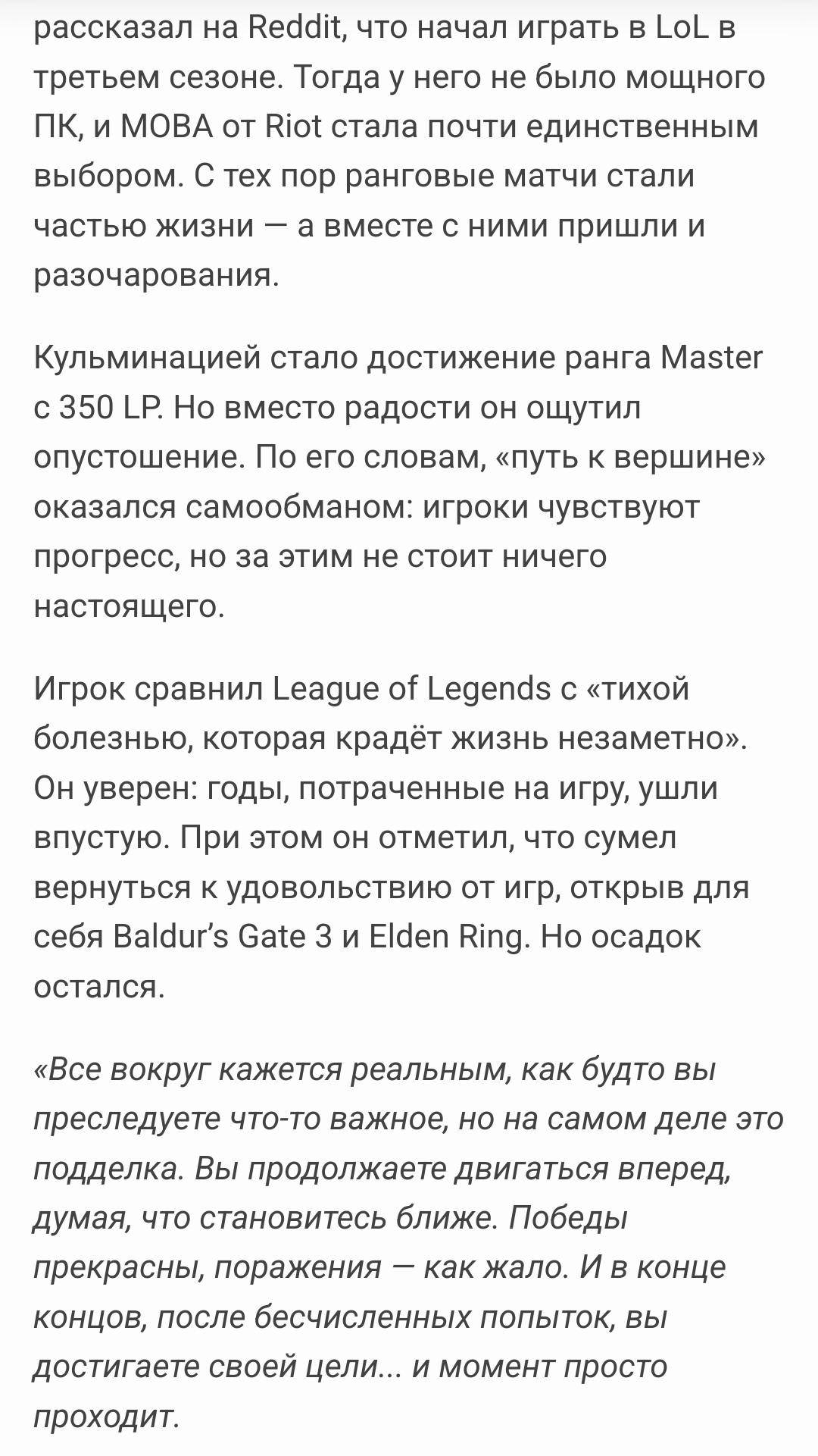 #### 3. Игра для избранных? Или просто токсичная помойка? Ты описываешь игру так, будто это шахматы, где всё решает скилл. Но на деле: - Матчапы решают всё — если у тебя в команде 3 AD против Мальфита + Раммуса, ты проиграешь ещё в лобби. - Один интующий игрок может свести на нет все усилия команды, потому что снежball в LoL — это не про "контерплей", а про "кто первый сдастся". - Баланс? Какой баланс? Каждый сезон Riot ломает игру новыми предметами, а потом месяцами "фиксят" это нерфами.