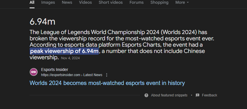 >>49861612 Сырок, почему во всех популярных онлайн-играх есть открытые данные по онлайну, почему во всех других играх огромное количество роликов и постов в самой популярной соцсети мира ТикТок, а ролики с Чемпионата мира по "самой популярной игре" собирают от силы 1,5 к - 3 к лайков. Это же тоже показатель популярности? Не так ли? почему на ютубе ролики про лол уступают тому же валоранту? Ты точно уверен, что самая популярная игра? Сырок