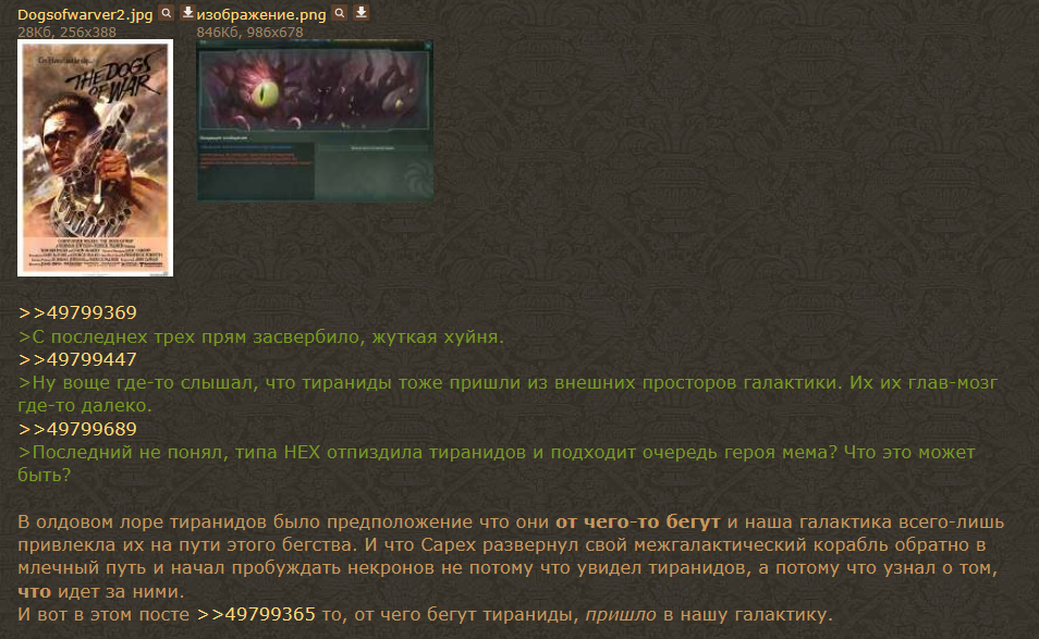 >>49855071 >Но при этом ебанутая вселенная не позволяет создавать альянсы для совместного боя против вражин. Почему не хотят? Содают. Тащемта например в Соле стоит целый крафтворлд на постоянке. Плюс, я запамятовал в каком из секторов, но короче там проходит каждый цикл эльдарский мир-корабль, и местный комендант инквизитор напрочь запретил вообще какие-либо препятствия ему чинить. Плюс раньше(хз, что по текущему таймлайну) на Лугганате вообще было посольство Ордо Ксенос. Плюс, дохуя инквов так-то у эльдар неиронично обучается - взять ту же Драксус, например. Ее вообще неиронично эльдары даже вооружали для борьбы ее против некрон. Чевак вообще у арелкинов гостил долго и его пускали в Черную Библиотеку. >Тираниды А тут какое дело...Прям совсем пиздец в лице полномасштабного вторжения до галактики еще не долетел. Когда он долетит там не то что эльдары в хоровод встанут с людьми - там хаоситы из очка вылезут со словами "брат, давай как до ереси, брат, плечом к плечу, брат"