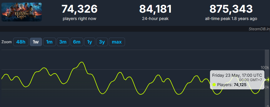 Вы понимаете что когда выйдет 4(!) игра совокала, даже так они не побьют онлайн дневной онлайн бг3 суммарно, может через лет 10, в понедельник днем, мы увидим что то близкое.