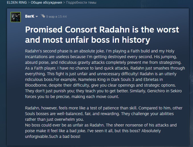 Дошёл до этих уебанов и снёс нахуй аналринг, я не могу. Это даже после патчей какая-то самая дисбалансная хуйня в истории, просто комбо и ты труп. Вот есть Иссин - ахуенный последний босс. Бой похож на красивый танец, он не читерный и не дисблансный, сражаться одно удовольствие. А пикрил - каловая хуйня, где ты как ёбаный колобок по кд катаешься, либо как еблан несколько раз подряд парируешь, когда в нормальных прошлых играх достаточно одного.