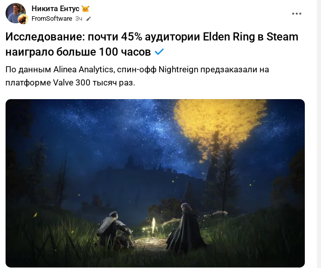" - От непроверенных источников всплыла информация, что, по неофициальным данным, следующей синглплеерной игрой Хидетаки Мемедзаки и From Software ожидается игра, за основу дизайна и мифологии которой взято древнеславянское язычество. По словам инсайдера, для вдохновения, Х.М. просмотрел множество советских картин и творчества о неоязычестве, подчеркнув, что, его всегда пленили подобные истории и стилистика. Древние духи, страшные славянские существа и нечисть, единение с природой. Игра создаётся на Unreal Engine 5. Якобы слитый скриншот прилагается. Анонс ожидается в 2027."
