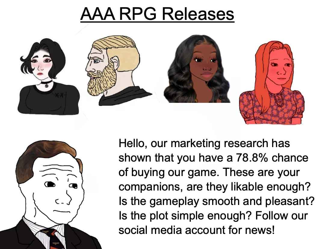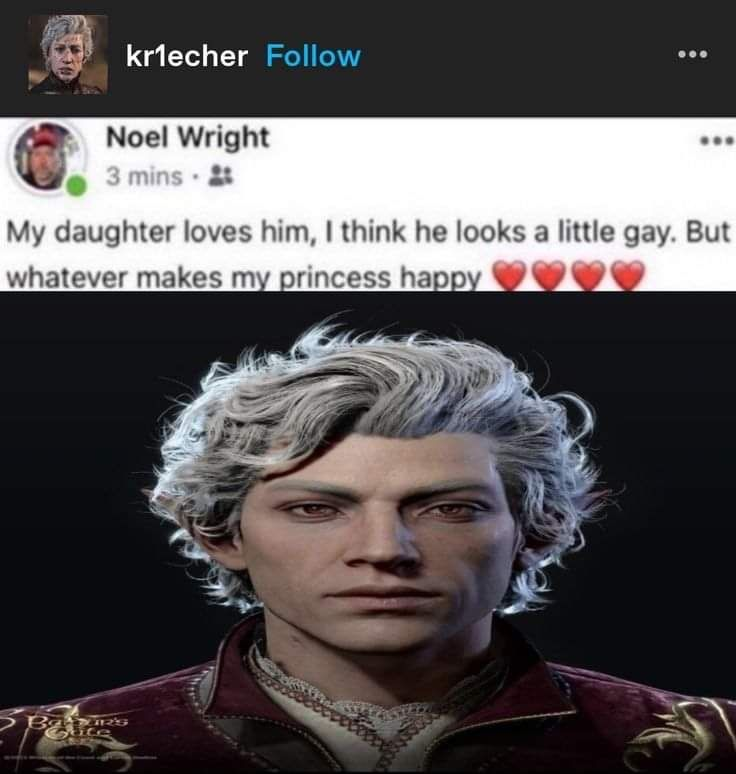 >>49851212 Начинаю новую игру, захожу в редактор внешности, первой же опцией мне предлагают выбрать местоимение для моего героя, ладно похуй, сделал мужчину с пенисом который идентифицирует себя как "он", но это никак не мешает буквально всем компаньонам мужского пола предлагать мне романтические отношения на вечеринке тифлингов. Это ненавязчиво?