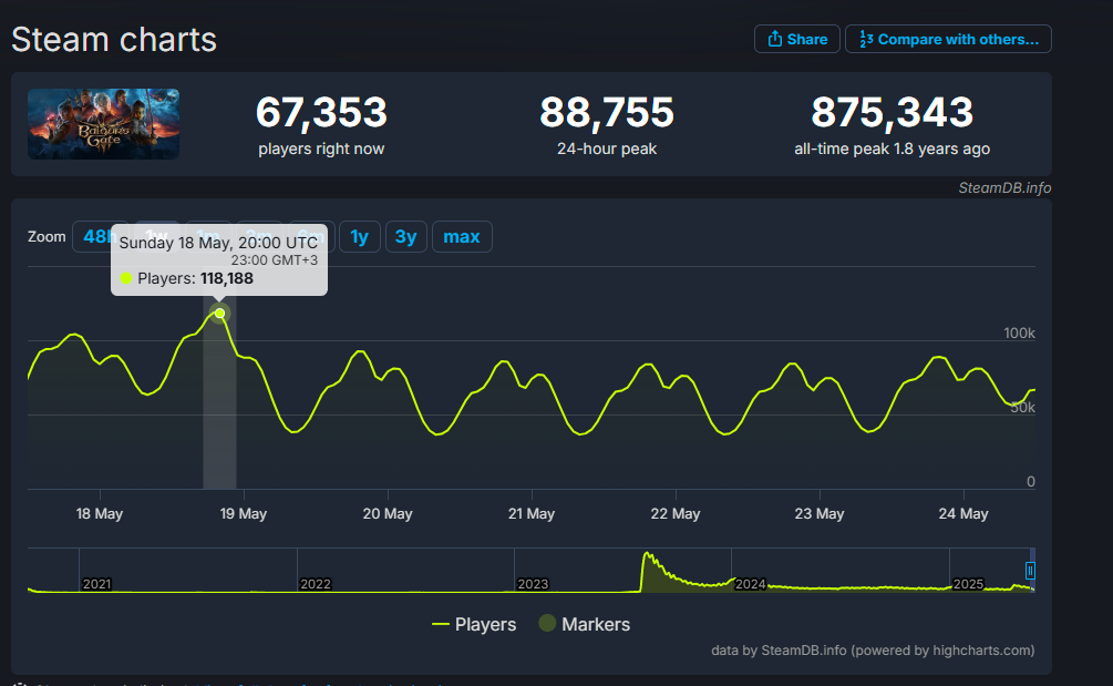 Первое прохождение бг3. Всё ждал патчей, багфиксов, доп контента и наконец прошёл. Так и не понял чего игра хайпанула. Сжв-параша на месте и её прям очень много. Багов я словил целую тонну. Вроде как куча выборов, но большая часть этих выборов ведёт к одним и тем же результатам. 90% разговоров в лагере - это блядская детсадовская романтика ни к месту, которая была написана человеком, который даже за ручку ниразу не держался. Графика посредственная, много где мыло мыльное. Сам мир и система прикольная, но ещё бы дндыху бы испортили - все бы ахуели. По актам - первый акт топ, второй видно слабенький, на третьем я настолько ахуел от багов - что хотелось уже дропать, но было жалко потраченного времени.