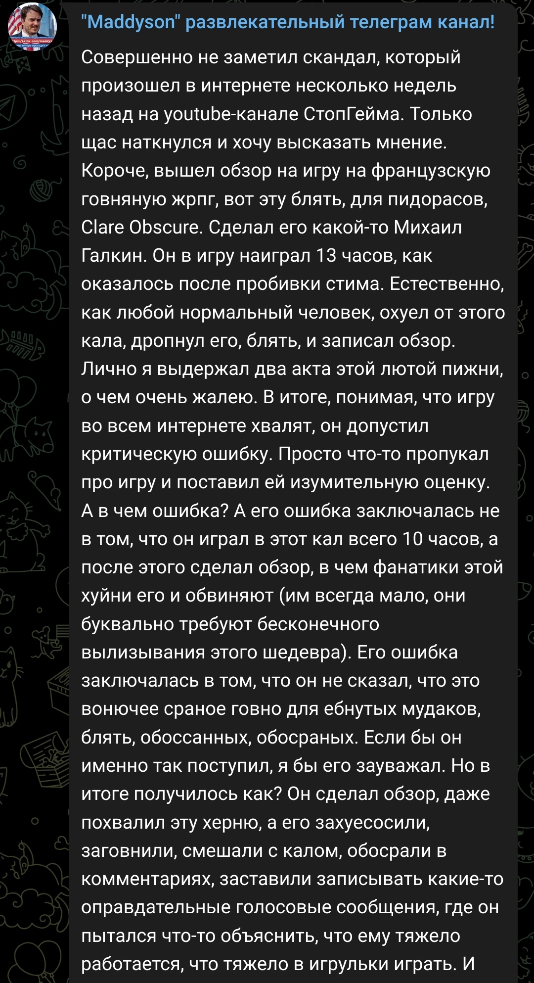 >>49909541 >Русская озвучка не плохая Её должен озвучить Володарский или Гоблач, чтоб она стала плохой? Она не то что плохая, она уебещна. А переозвучивать песни, до такой наглости и извращения даже рудаб в фильмах не доходит. А тут натаха прокуренная превращает своим голосом прекрасную мелодию в какую-то нелепую частушку. >Не все захотят играть в сюжетную игру и читать субтитры. Таким и играть в игру на реакцию с рпг элементами тоже не стоит. Если для таких выродков читать субтитры проблема, то принимать участие непосредственно в геймплее и читать буквы спелов - будет задача в десять крат сложнее. На самом деле всегда в голос с ебанатов ''не каждый хочет читать!'', типа буквально люди признаются в собственной инвалидности.