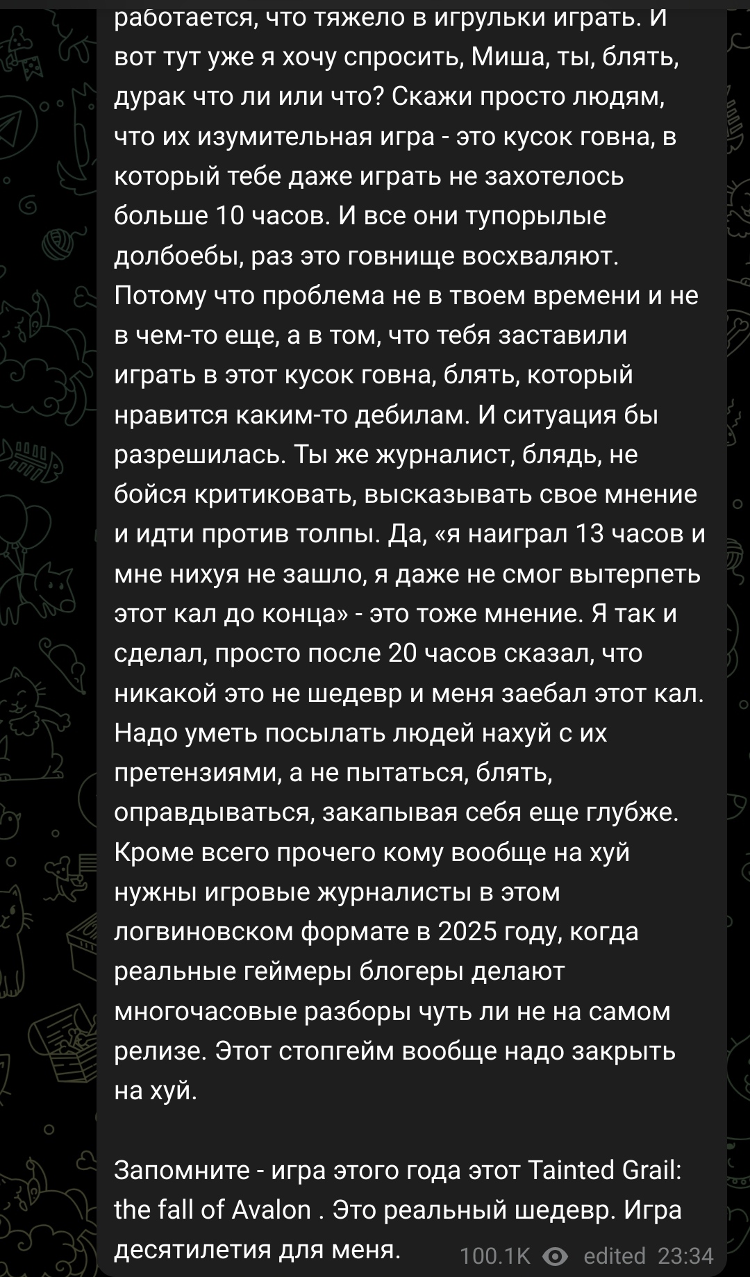 >>49913633 >Попробуй thaumaturge, Спасибо за совет, но, как я понял, это Покемоны на Урине Инженера 5, что совсем не мой жанр. > вам вроде больше не во что играть и грустно Я понимаю dat feel треда, после Экспедиции тяжело воспринимать остальные игры с драматургической точки зрения, все кажется поверхностным и не серьёзным. Слишком уж многим сюжет попал прямо в сердечко.