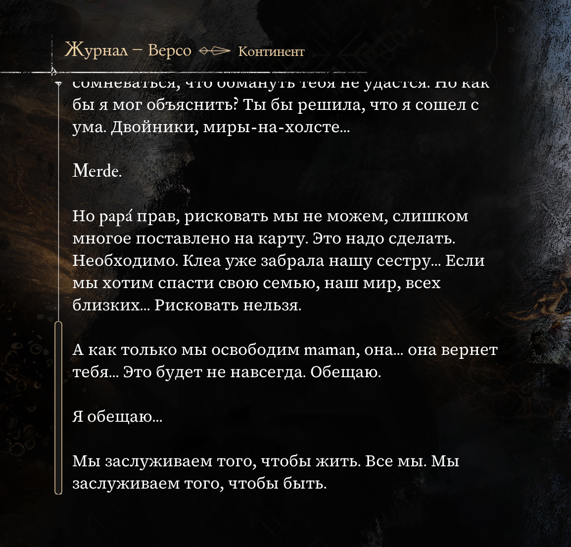 Что плохо в лоре - что за ебучие карты у Сиэль и что -а силы Света у Версо? Люнэ ок, начуились рисовать на себе пиктосы, знаки какие-то, сценаристка говорила что они изобрели целый магический язык которым писали на коже прошлые экспедиции но вырезали это из игры, а то получалось перегружено. Маэль особенная, ок, хотя вопросики про горящие атаки (она подожгла холст, видимо) остаются. Версо еще окей, мог научиться управлять светом, долго тут сидел, пердел, ну и он тоже особенный. Но откуда у Сиэль целая дисциплина которая неизвестно откуда взялась? Это наследие прошлых экспедиций? Это обычная в настоящем Люмьере дисциплина которая наследуется в нарисованном? Это ее личное вуду? Если в зомби 32й экспедиции мы встречаем колдунов, то сиэлеобразных бойцов не встречаем...