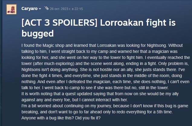 >>49922836 1. Это два разных показателя. Смотри на примере этой робы, она даёт бонус и к спасброскам против чужих и бонус на ролл твоим. https://bg3.wiki/wiki/Robe_of_the_Weave 2. Некоторые части разбросаны в рандомных местах, так что считай что так задумано. Да, логики особо нет, радуйся что это, вроде, единственный такой квест на всю игру. Проще сразу спиздить награду карманником, там последняя часть аж перед Орин будет, а это уже считай почти конец игры обычно. 3. Сам в своё время искал где можно глянуть, не нашёл, считал в уме. Если кто-то найдёт, то тоже интересно посмотреть будет.