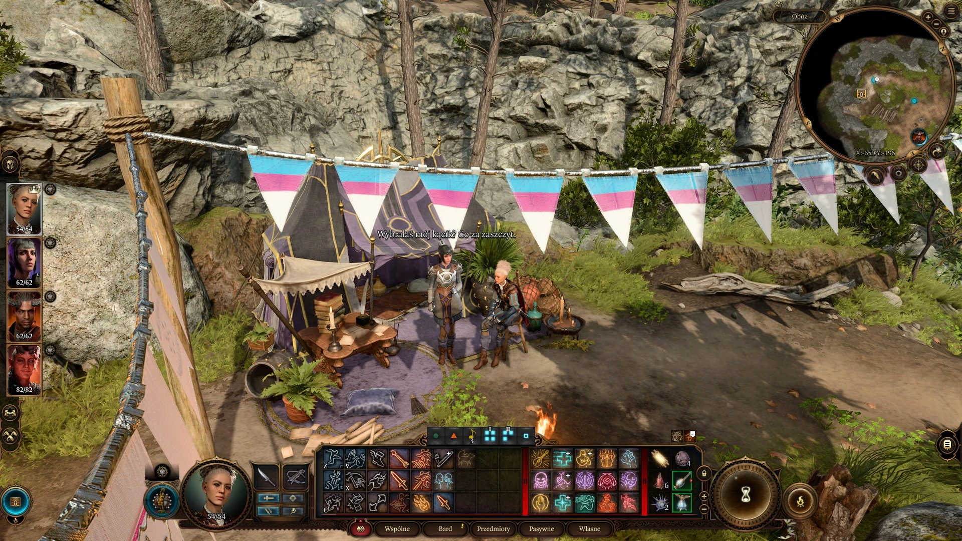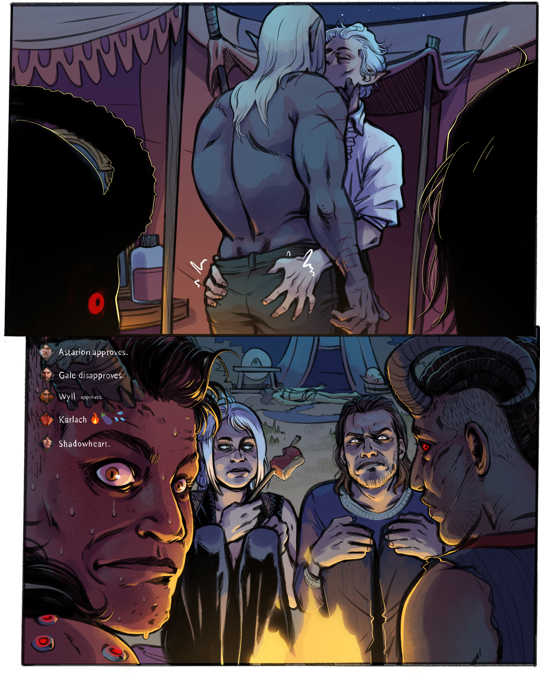 Халсин вне палатки будет жить, в таком случае. С этим фактом есть забавный баг: один из лагерей во втором акте не имеет стоячего места для Хальсина, если рекрутнул Миниару. В таком случае, в этом лагере его нельзя будет найти, а если открыть его инвентарь, то в окне персонажа будет лишь его левитирующая голова (жаль сейвы второго акта не сохранились, я бы показал тогда).