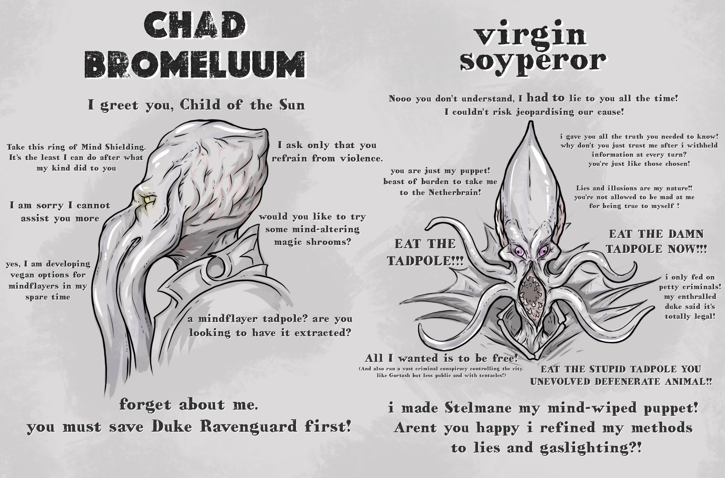 >>49923757 Ну во первых Рафаилу вон поверил анончик ИТТ, считает годным вариантом. Во вторых до его многоходовочки с Юргиром хуй докопаешься. Есть ещё Горташ и сам план на бумаге вполне ок, его просто выдаёт то, что он избранник ебаного бога тирании и делить власть для него - примерно как для Дурга не_убивать - слишком сложная опция. Зариель сидит пердит себе в аверно, пока за её вышибалой гоняют шестёрки, при этом ещё и думают, что они важны. Чтобы докопаться до мякотки Импи надо прям совсем настойчивым быть, я опцию прожимал отыгрывая мудака, а оказался прав. Влакит хорошо так жабам в уши нассала, жабка на довольно высоких отношениях может из пачки ливнуть на не той опции. Там прямолинейность начинается или заведомо с позиций силы, или когда ну очень сильно копнёшь. Ну или если ты прям прочно стоишь на стереотипах - илитиды=мрази, дьявол обманет, избранный тираном всегда останется тираном...