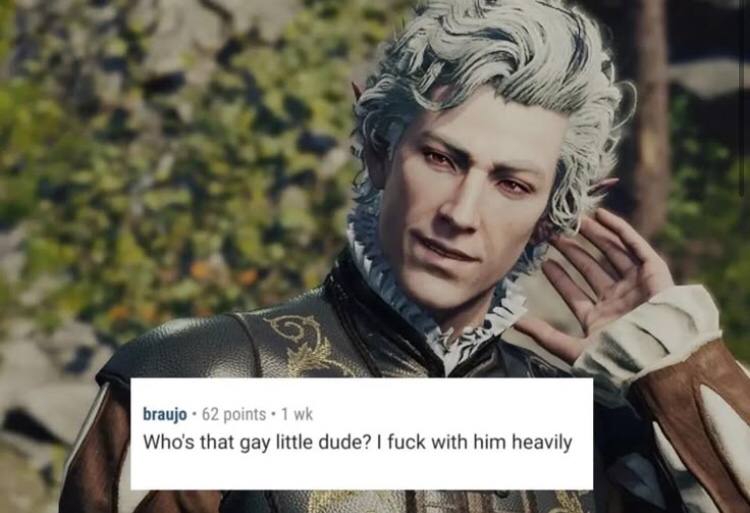 Поинт в том, что персонаж полностью противоречит не только своему бэкграунду, но и сеттингу вообще. Не то чтобы я жду прям ГРИМДОРК и побуквенного следования рулбукам, но блядь не настолько же хуй класть теперь. И раз уж про дроу вспомнил - вон тебе Ментяра как пример, ведёт себя как дроу. Самовлюблённый вомпер-пидор ведёт себя как самовлюблённый вомпер-пидор. Жаба ведёт себя как жаба. И тд. И только этот красный мартин лоуренс танцульки танцует и радуется булочке и трамвайчику.