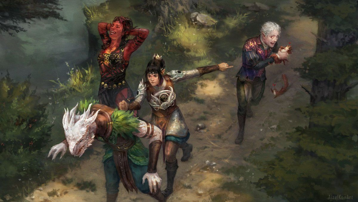 Мой очередной отряд по спасению калитки вот он, слева направо: Зенит Феурсел - Бард мечей(Временная замена Джахейры) Карлах - Барб-дру Керз - Барб-файтер Астарион - Монк тени