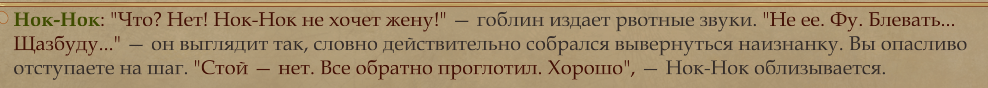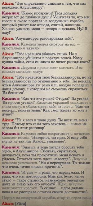 >Чудовище исчезло, и вокруг вновь стало тихо. На столе поднимается пар от свежего печенья и ароматного чая. Арушалай окидывает свою мечту взглядом. Вы никогда не видели на ее лице такой радости. "Я... Просто хочу жить здесь, в мире смертных. С тобой. Я разгадала загадку богини. Вот моя настоящая мечта!"