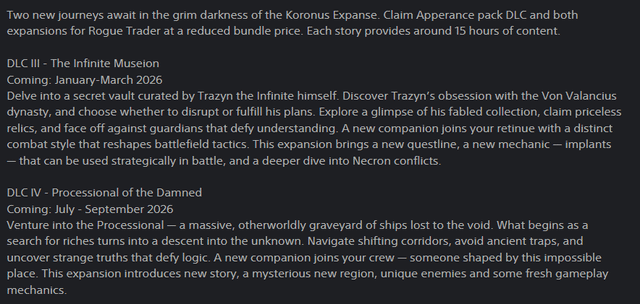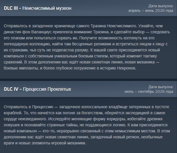 Новости: 1) Owlcat представила The Expanse: Osiris Reborn, Аction RPG по вселенной Экспансии. Анонсирующий трейлер: https://www.youtube.com/watch?v=pIQifuOTTe8 2) Анонсирована следующая игра совокотов по вселенной Warhammer 40000 - Dark Heresy Анонсирующий трейлер: https://www.youtube.com/watch?v=mmfu_Spm-6U 3) Первое длц для RT, с компаньоном-ассасинкой культа смерти и расширением корабля — вышло. Второе длц, с компаньоном-негром-арбитесом-пидорасом, его летающим киберпетушатником и НОЛОГАМИ — выйдет 24 июня. Третье длц про Тразина Неисчислимого и его бляцкий музей запланирован на апрель – июнь 2026 года. Четвёртое длц про космическую помойку запланировано на июль – сентябрь 2026 года. Релизный трейлер Void Shadows: https://www.youtube.com/watch?v=hsgKGORxxXc Релизный трейлер Lex Imperialis: https://www.youtube.com/watch?v=FHDfU-iQRhI 4) Патч 2.5 для ВОТР с реворком мифика Золотого дракона вышел, заодно появилась GOTY версия со всеми контентными дополнениями. Это последнее добавление контента в игру. Кто ждал финального релиза - это он.