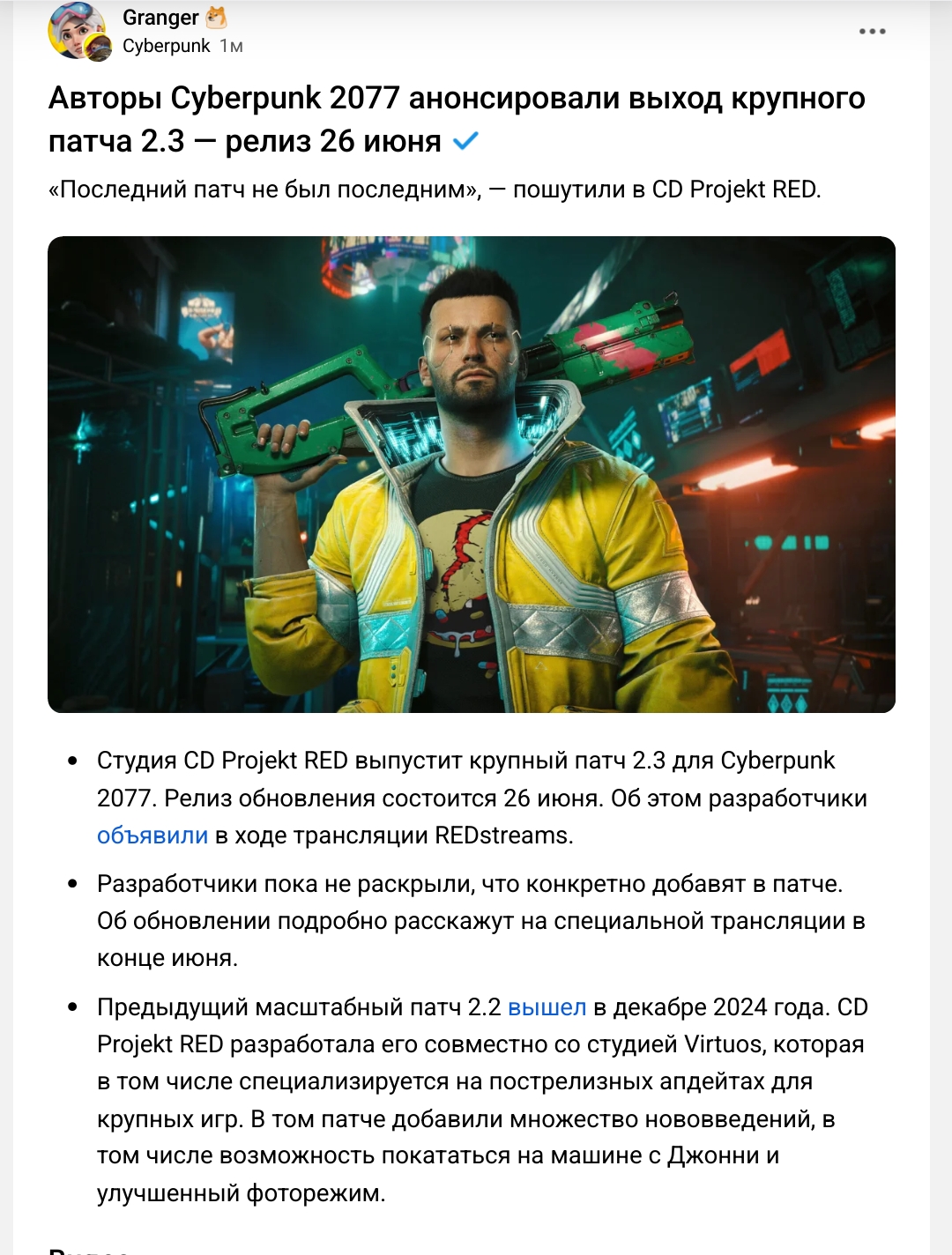 CD Projekt RED выпустила полное издание Cyberpunk 2077 (Ultimate Edition). Оно доступно для покупки на PC, PlayStation 5 и Xbox Series. В комплект уже включён патч 2.1 и дополнение Phantom Liberty.