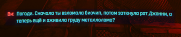 Ещё страннее то, что у Ви уже есть охуенный статус, весь город зауважал, каждая собака знает. Потом Ви идёт и штурмует Арасаку. В одиночку. Убивает ёбаного Смешера. И что? А нихуя. Всё так же, "ты пока не считаешься легендой". Ну, наверное, без сдохнуть совсем никак. Хотя Ви тут преуспевает, но никто же не в курсе. Кроме Бестии, но ей Джонни сообщил.