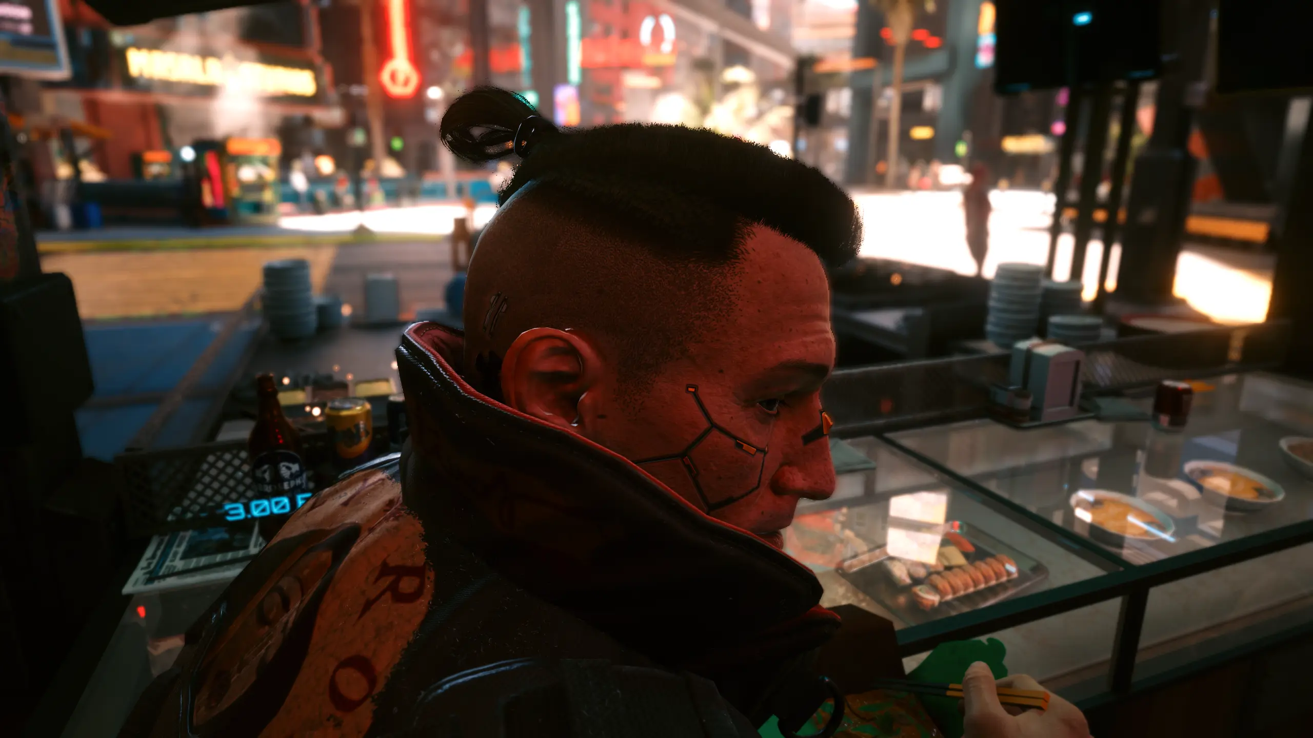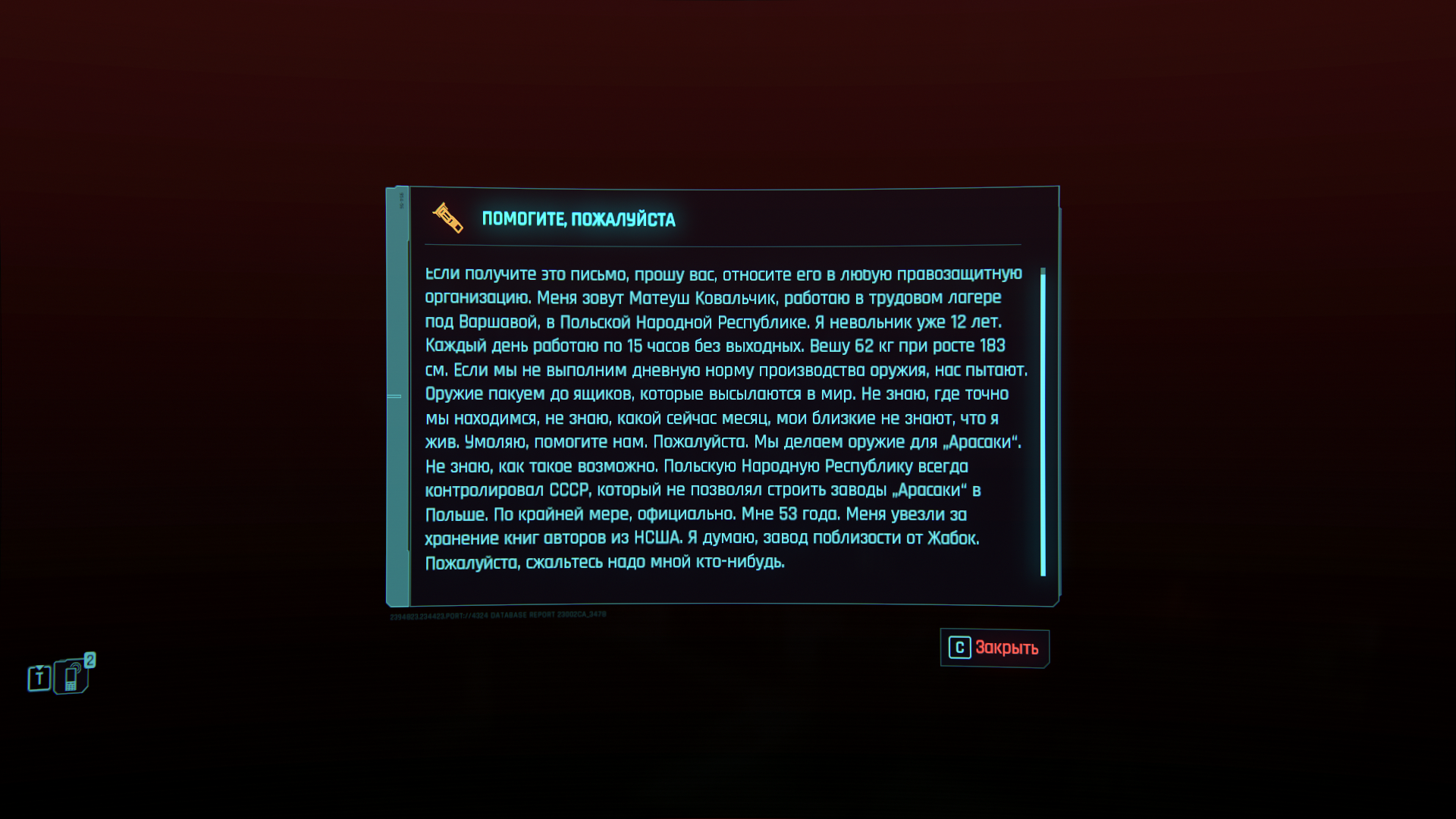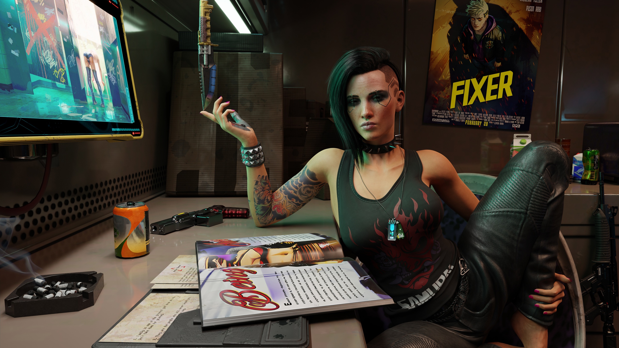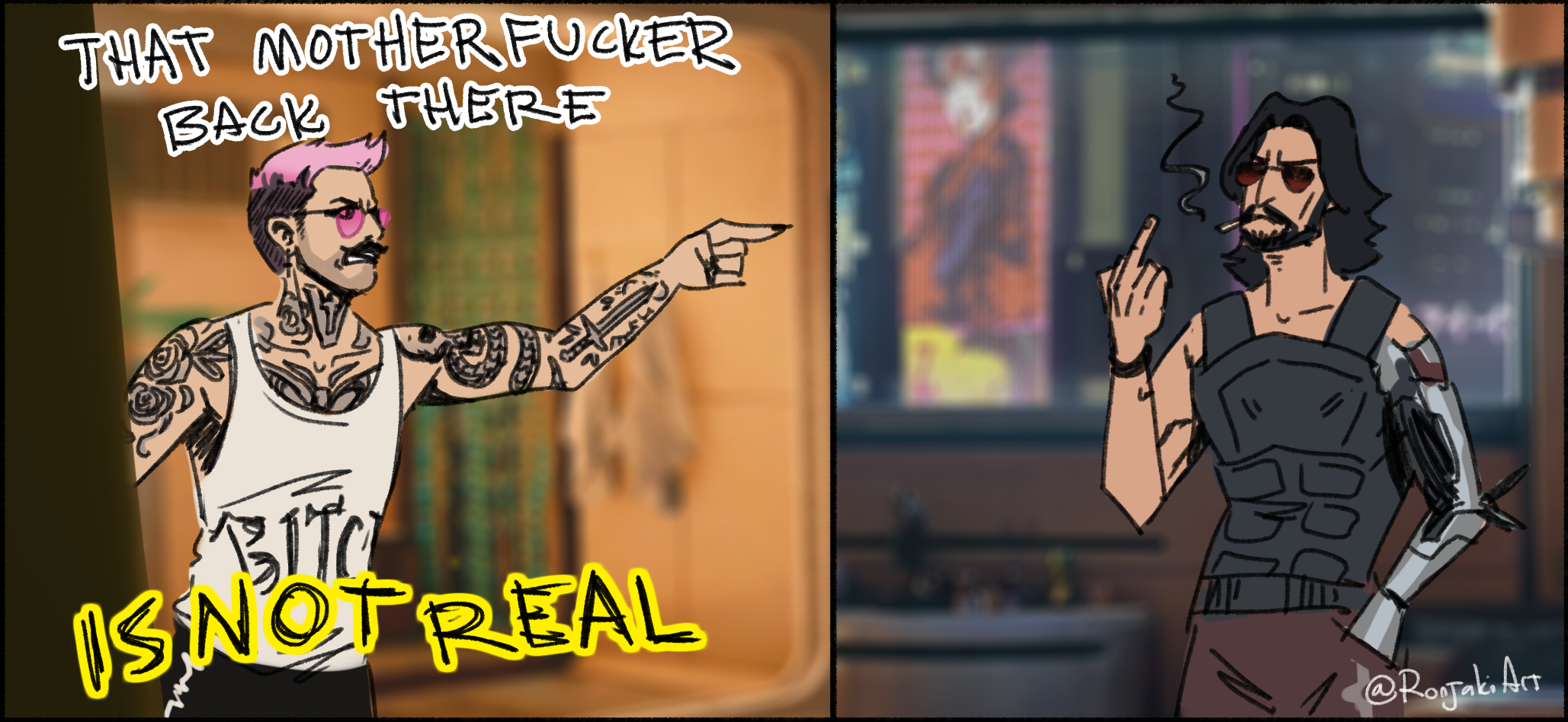 Смотрим дальше. Концовка с передачей тела Джонни, в профиле отображается статус репутации "всё ещё не легенда". То есть пробраться в башню Арасака, убить там всех, кого можно, запинать Смешера и выбраться обратно - недостаточно, чтобы стать легендой. Из этой концовки запоминаем ещё одну вещь, а именно Джонни покупает распиздатую гитару за 5к эдди. Теперь вспоминаем момент с первой встречей Евродина. Когда осматриваешь его гитары, Ви говорит, что это стоит дохуя, на что Джонни поддакивает - у нас столько никогда не будет. При этом пиздатая гитара стоит 5к эдди. Даже если гитары Керри в десять, в сто раз дороже - это всё ещё небольшие деньги, но только по меркам геймплея. То есть сюжетно Ви конченный нищеброд, о чём говорит хотя бы уведомление об очередной просроченной квартплате на пекарне. Запомнили эту хуйню. Теперь концовка, где Ви оставляет тело себе. Статус - легенда Найт Сити. То есть Ви продолжает карьеру и не сбавляет обороты. Да, харкая кровью и ловя приходы. Но успешно делает дела, от чего скулит Джуди, например, если её романсить. Живёт в шикарной квартире, летает на ави, а Деламейн говорит, что у Ви "неограниченные ресурсы". Карьера идёт охуенно. То есть этот инвалид может творить разную хуйню, даже находясь одной ногой в могиле.