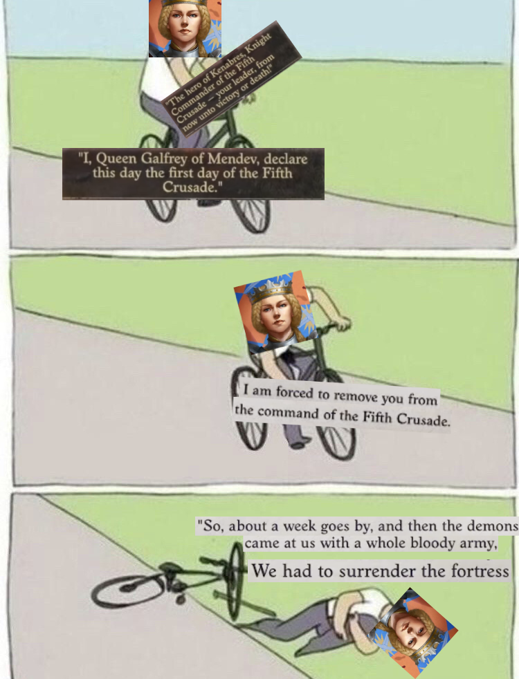 Собственно, в пятом акте остаются только последние два, и как им можно было проебать, имея собранную армию и кучу построенных бастионов - загадка века. Авторы это подают "ну прост королева не справилась)". Но дело-то не в том, что Голфри просто хуже. Дело в том, что нигде и никогда просто не показываются те силы, которым можно проебать. Ну не отрядам бомжей же она проебала, с которым сражается даже не гг, а его генералы. А сам игрок гуляет по язве как у себя дома. Причём я напомню, что кроме королевы есть как минимум ещё рыцари преисподней.