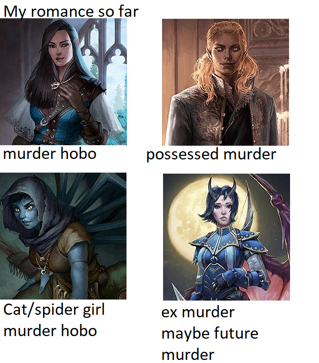 Что столпы, что авовед, что аутер ворлдс, что столпы 2 - все абсолютно одинаковые игры. Да, столпы 1 помрачнее столпов 2 и авоведа, но персонажи там абсолютно такие же унылые зацикленные на себе уебаны, романсов так же нет, абсолютно одинаковый объём повестки во всех играх обсидиан.