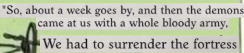 >>49951904 Вообще это один из самых главных нарративных проёбов. По сюжету в язве всё кишмя кишит демонами, Голфри рассказывает, что крепость осаждается, демоны всё прут и прут, как в думе каком-то.