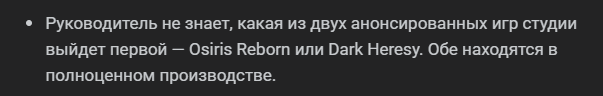 Я думал, что Дарк Хереси уже скоро будет, лол. А тут не понятно, что выйдет раньше. Так что теперь еще 2-3 года ждать. Не понятно только одно, нахера они так рано анонсировали Дарк Хереси, если там до релиза еще хер знает сколько.