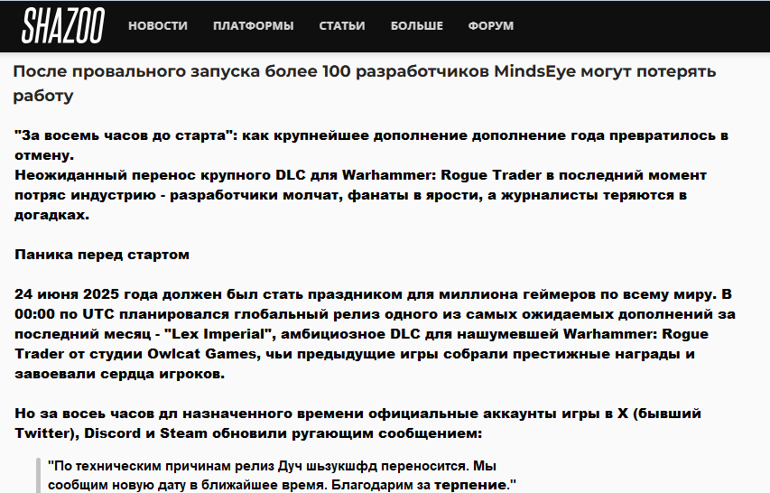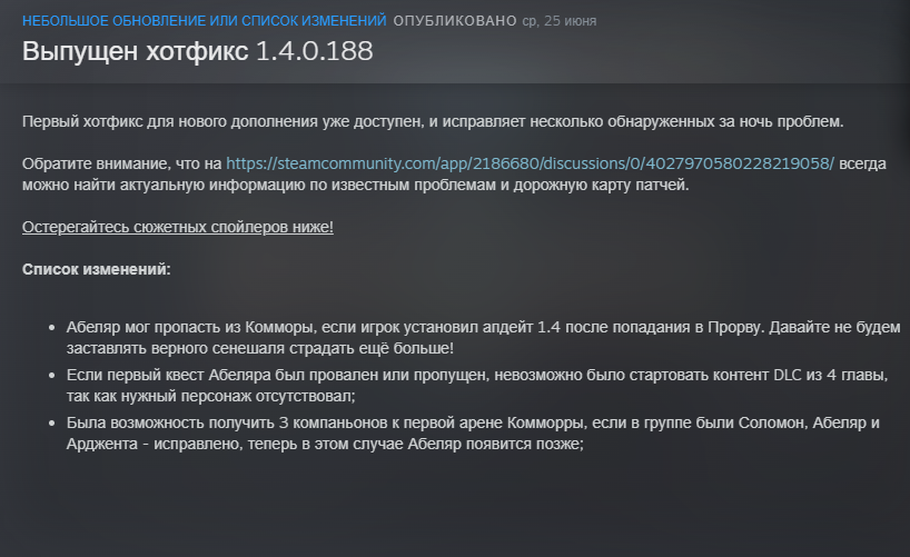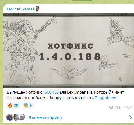 Новости: 1) Owlcat представила The Expanse: Osiris Reborn, будущая Аction RPG по вселенной Экспансии. Анонсирующий трейлер: https://www.youtube.com/watch?v=pIQifuOTTe8 2) В разработке следующая игра совокотов по вселенной Warhammer 40000 - Dark Heresy Анонсирующий трейлер: https://www.youtube.com/watch?v=mmfu_Spm-6U 3) Первое длц для RT, с компаньоном-ассасинкой культа смерти и расширением корабля — вышло. Второе длц, с компаньоном-негром-арбитесом-пидорасом, его летающим киберпетушатником и НОЛОГАМИ — выйдет 24 июня. Третье длц про Тразина Неисчислимого и его бляцкий музей запланирован на апрель – июнь 2026 года. Четвёртое длц про космическую помойку запланировано на июль – сентябрь 2026 года. Релизный трейлер Void Shadows: https://www.youtube.com/watch?v=hsgKGORxxXc Релизный трейлер Lex Imperialis: https://www.youtube.com/watch?v=FHDfU-iQRhI 4) Патч 2.5 для ВОТР с реворком мифика Золотого дракона вышел, заодно появилась GOTY версия со всеми контентными дополнениями. Это последнее добавление контента в игру. Кто ждал финального релиза - это он.
