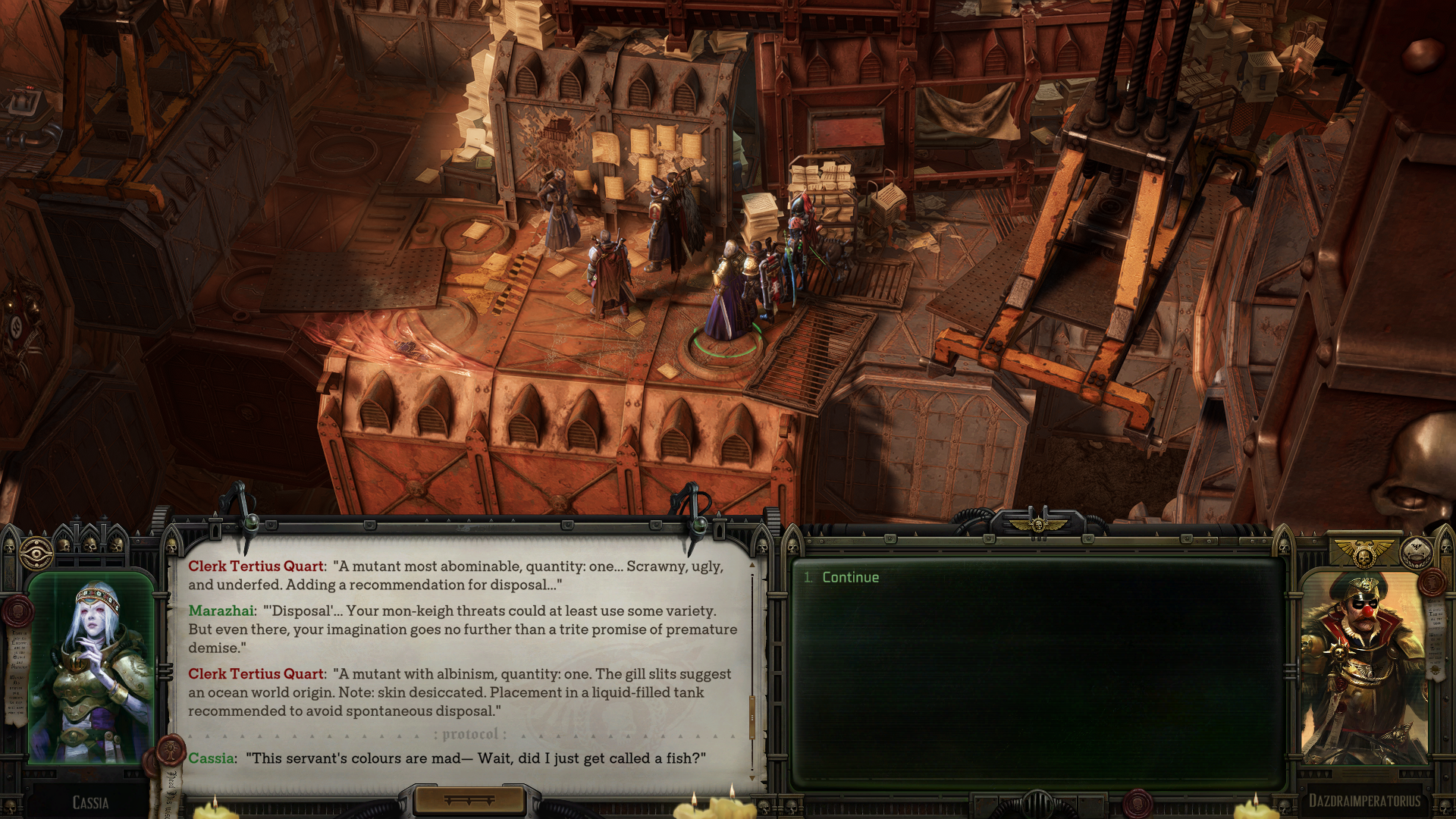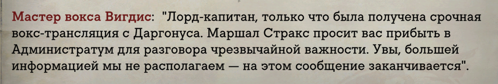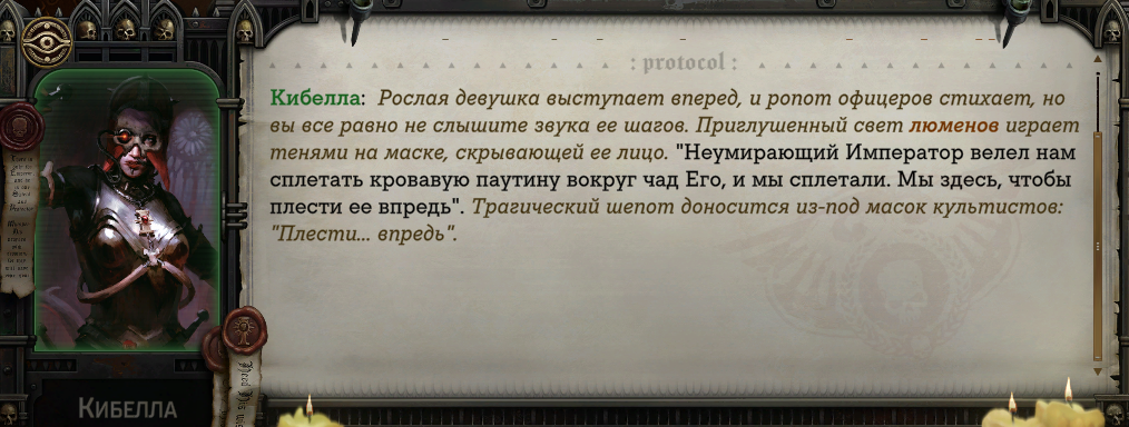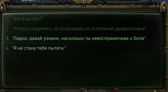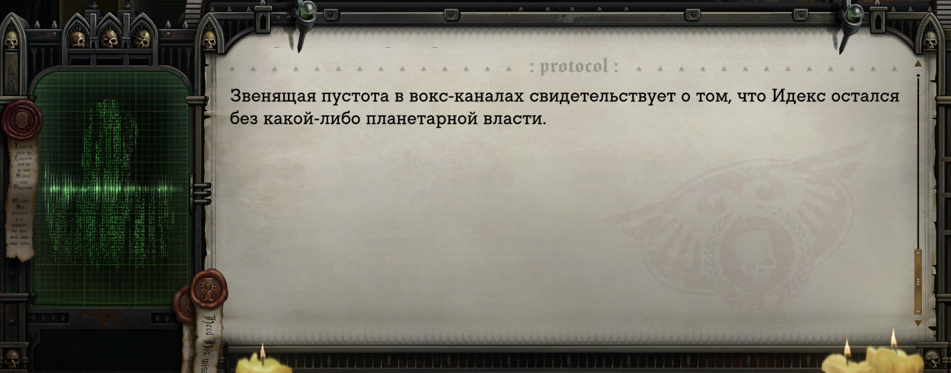 >"Передача губернатора прерывается официальным запросом с планеты. Власти Идекса утверждают, что с вами на контакт пытался выйти член секты аристократов-еретиков, сбежавший из-под надзора стражи. Во имя Империума правительство планеты просит немедленно уничтожить предателя." >"Вышедший на вашу персональную вокс-частоту губернатор шепчет, что действующая власть Идекса — не те, за кого себя выдают. На планете произошел бунт, у власти встала еретическая секта. Губернатор умоляет немедленно нанести удар по дворцу правительства. Без верхушки новая власть не сможет удержаться у руля!" И кому верить? Где опция разъебать обоих?