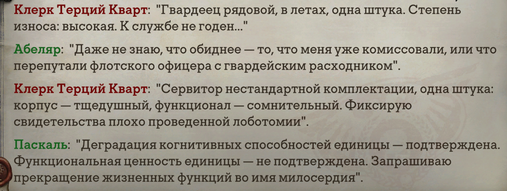 >Мутант-альбинос, одна штука. Судя по жаберным прорезям — родом с океанического мира. Примечание: кожа иссохшая, рекомендуется поместить в контейнер с жидкостью во избежание преждевременного списания в утиль. >Сестра Сороритас — одна штука красоты неописуемой, стати совершенной и величавости необыкновенной. >Мерзновенный мутант, одна штука... Тощий, уродливый, недокормленный. Сопровождаю рекомендацией к утилизации... >Женщина бледная, долговязая, одна штука. Многочисленные следы побоев, признаки истощения. Подходит под категорию "Слуги". Подкатегория "Нерадивые".