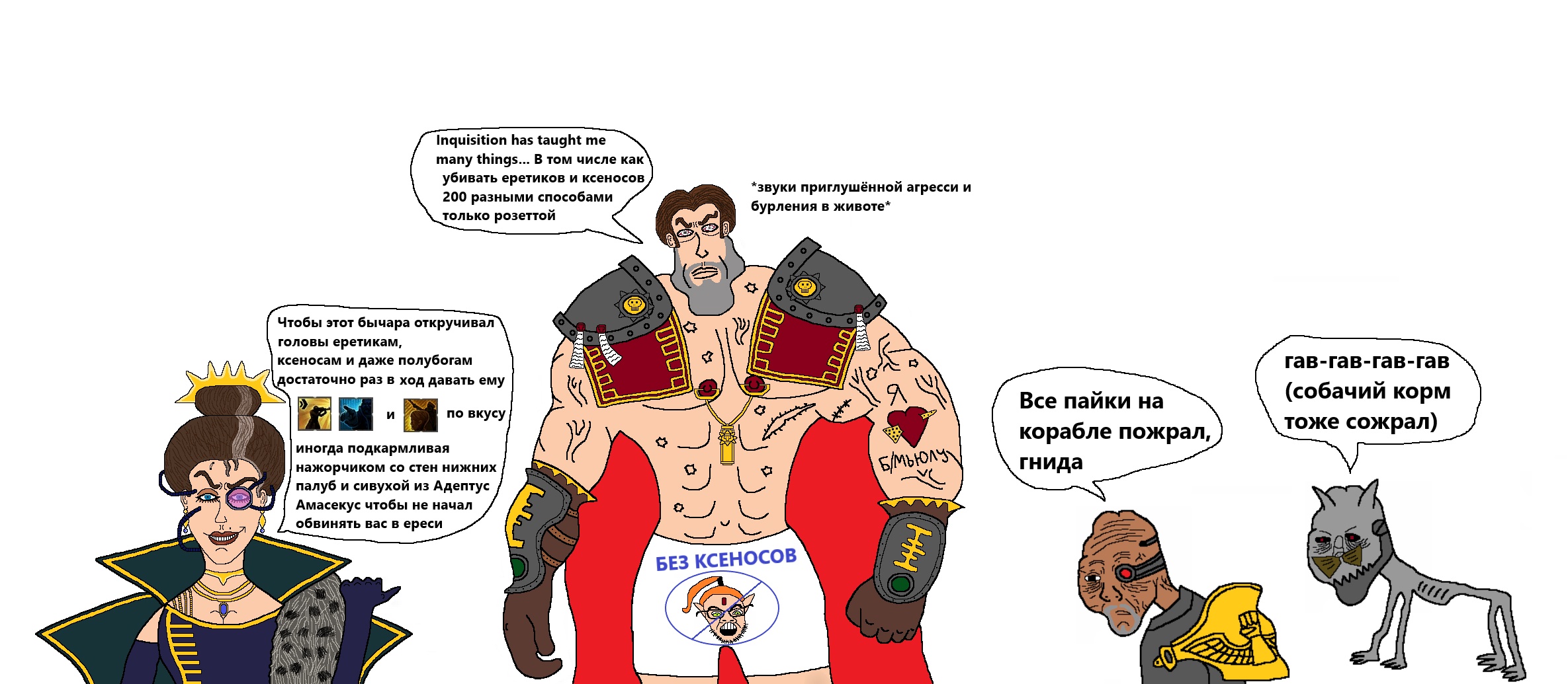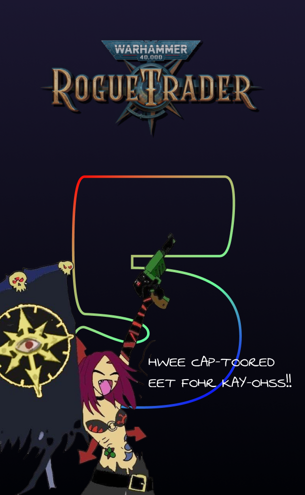 КАЖДОМУ ВАХАЕБУ, ВАХАФАНУ, ЗАЛЕТУХЕ И ЗНАТОКУ ЛОРА ЧИТАТЬ ВНИМАТЕЛЬНО: Совокоты известны крайней разношерстностью своих сюжетов — в одной игре может сочетаться как аниме/трансухи/соя так и самые базированные персонажи. А также известны своим вольным отношением к сеттингу: с Вахой это может вызвать горение жоп. Воспринимайте Rogue Trader как неканоничное произведение или фанфик. Хотите 100% следования "канону" — идите почитайте рулбук.