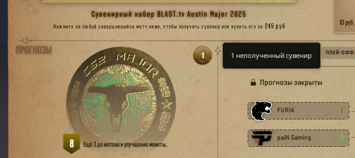 >>49933862 Во всех трех, лол. Ну там если предикты верные дать к грандфиналу, то будет золотая. Но в целом похуй, надо сувенирок набрать будет и слить по 200 рублей. 4 штуки дадут.