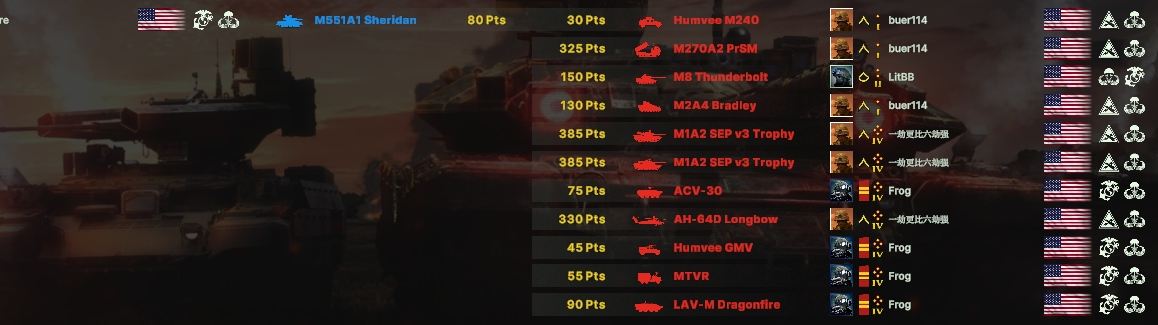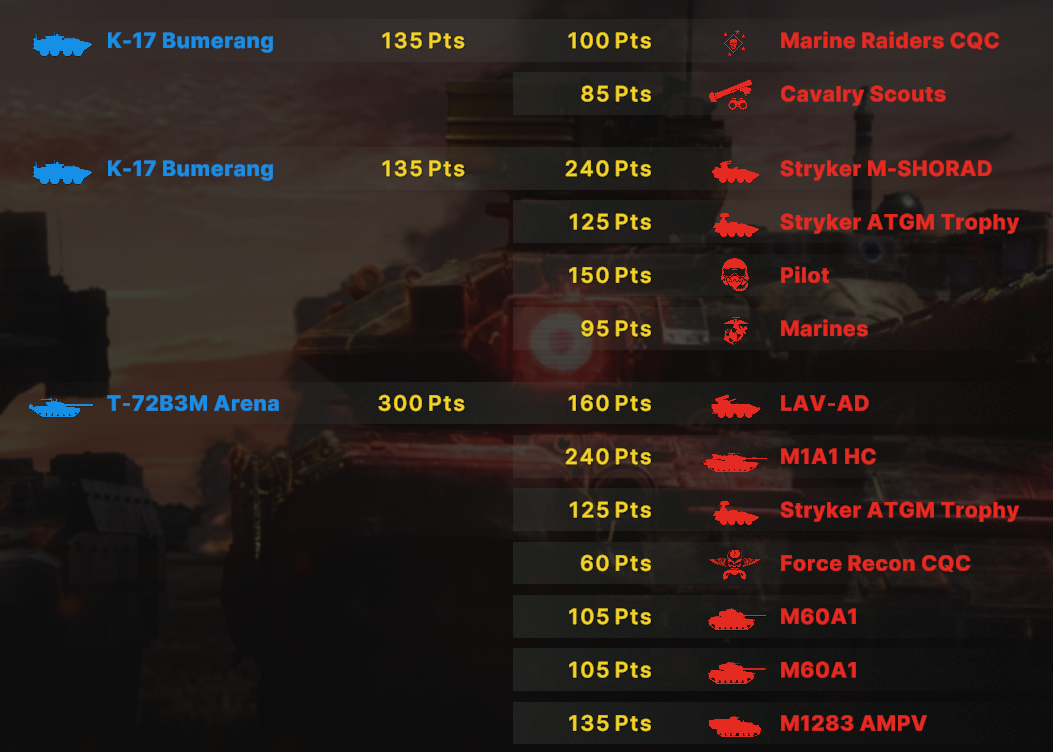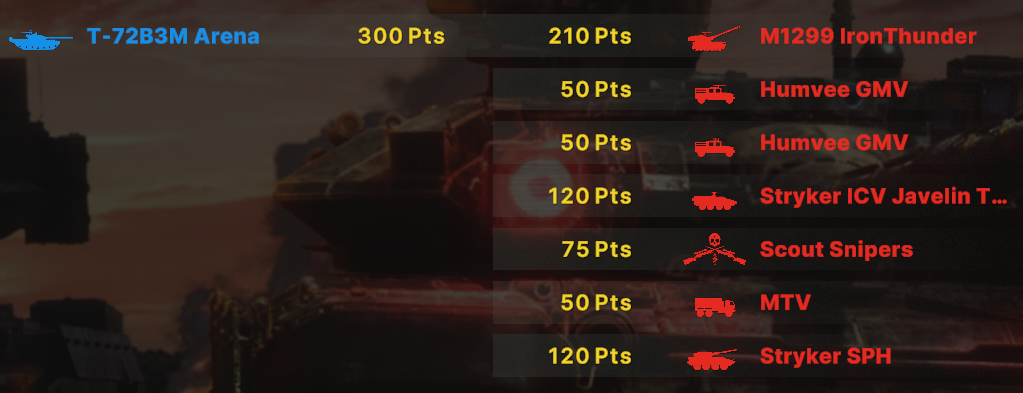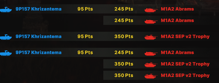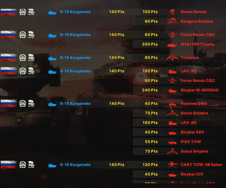 Как итог абрамсы едут вперед тандеры чуть за ними, чтобы не попасть под фокус ломов. Птуры сбиваются казами, а в перестрелке ломами задняя дешевая линия позволяет победить.