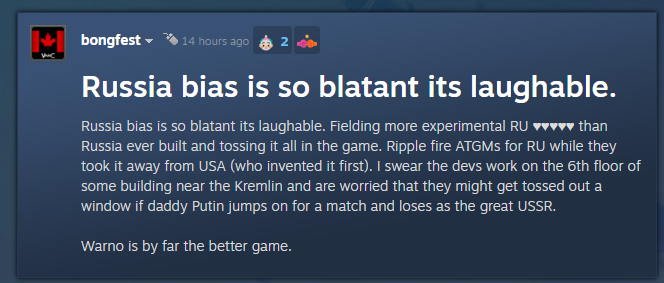 Продолжаю короче проходить компанию, пройдя таки миссию с вертолетами, и поробовал компанию за США ииии Ровно 0 превозмогания, бесконечные ресурсы, ахуевшая техника и постоянная поддержка авиации, которая уничтожает десятки коробочек в мясном раше. А разрабы точно не предвзяты? А то еще на бете были моментики с явно переапаной пендосской техникой и абсолютно ебейшей их пехотой.