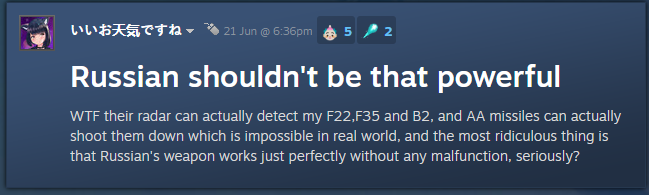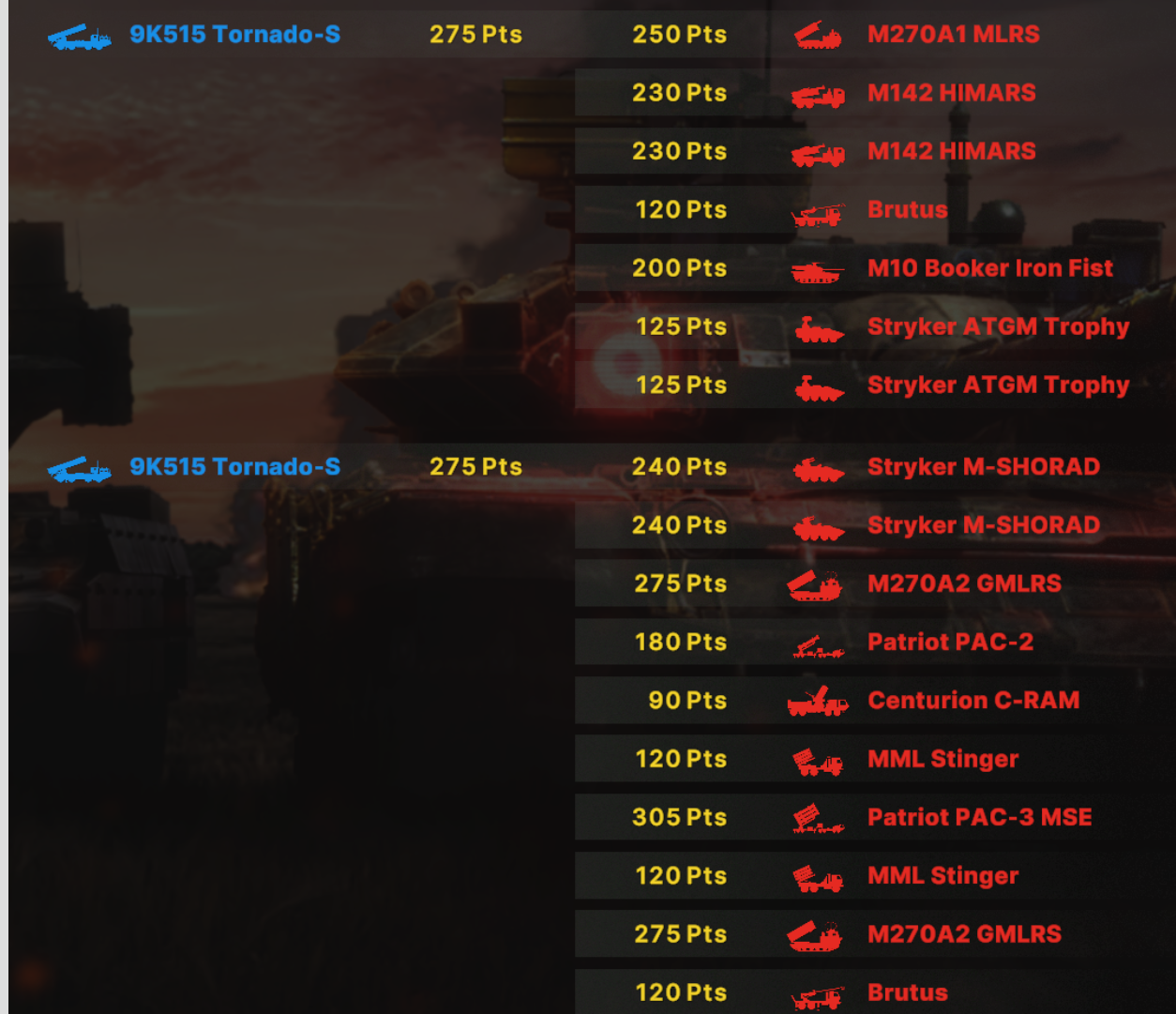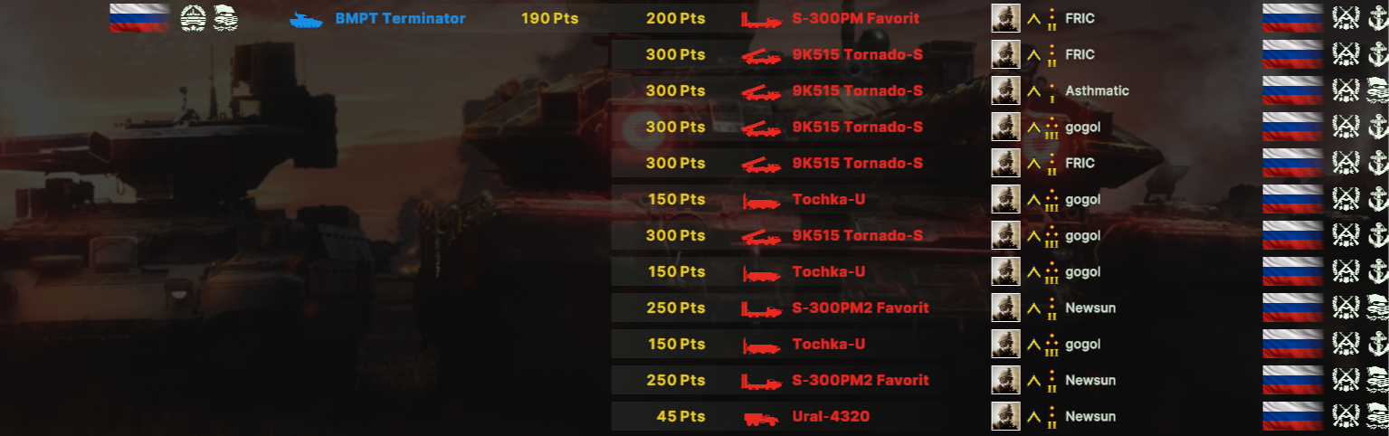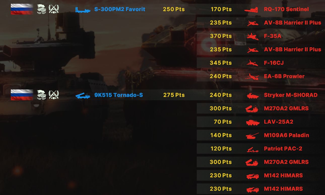 Поддерживаю амерошиза отчасти, С-300 с Тором это пиздец. 8 ПРР идут просто нахуй, долетит максимум 1-2, обычно вообще 0 нахуй. У чуваков щас как минимум 6 Ass-300 стояло, я в ахуе был просто. Су-24 конечно ебал как кулак самого Бога, но это был исключительно суицидный забег, а на мой МиГ-35 им было категорически похуй, приходилось их с Торнадо выбивать чтобы хоть как-то реализовывать воздух. Про вертолеты вообще вопрос не стоит, я их после первых минут 15 просто перестал вызывать. Патривроты и ЛАВ-АД конечно тоже мозги могут пропарить но сука не на столько. Даже не смотря на то что Патриоты из-за их паттерна запуска ракет сбить ПРР сложнее Амеродрочеры как будто их в меньшем количестве что-ли берут, не так охуеваешь с количества ракет ПВО в воздухе. Против русских всегда у каждого в деке есть как минимум одна 300 и парочка Торов/Буков/Ос не говоря уже про ПЗРК которого на точках как говна за баней.