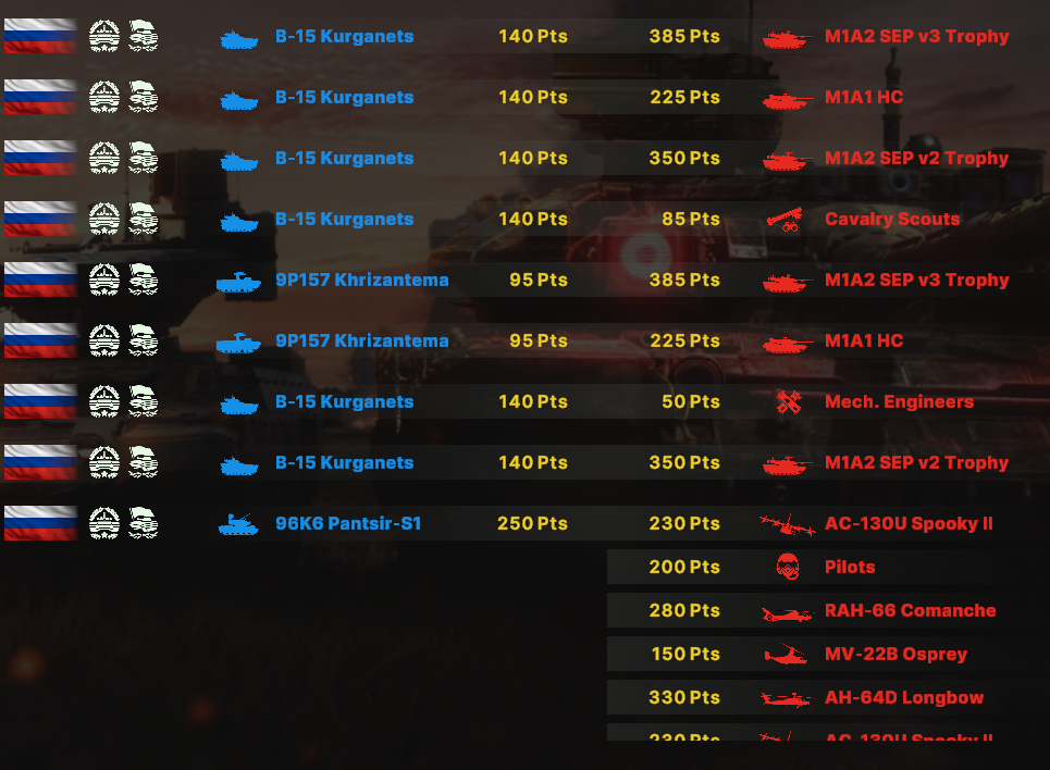 Танки у РФ ? Дороже блять. Сраные танки на РФ. Это же база подобного баланса - дешевые советские танки, чтобы набигать на ламанш. Но вместо этого у меня катаются панцири, которые ссыкливо прячутся от вездесущих абрамсов, которые валят тысячами.