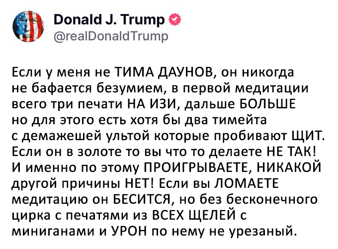 >>49954966 Я заметил что если у меня не тима даунов он никогда не бафается безумием, в первой медитации всего три печати на изи, дальше больше но для этого есть хотя бы два тимейта с демажешей ультой которые пробивают шит. Если он в золоте то вы что то делаете не так и именно по этому проигрываете, никакой другой причины НЕТ! Если вы ломаете медитацию он бесится но бесконечного цирка с печатями из всех шелей с миниганами и урон по нему не урезаный.