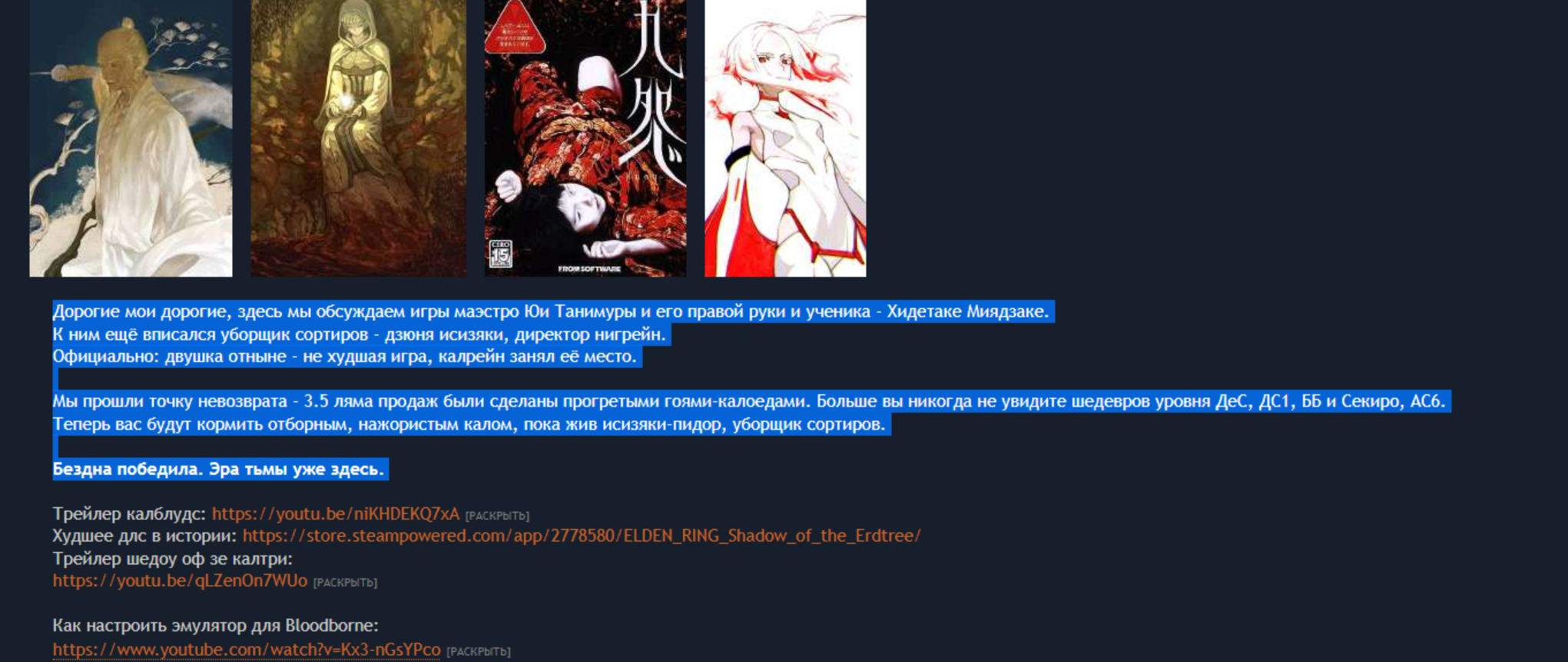 Дорогие мои дорогие, здесь мы обсуждаем игры маэстро Юи Тaнимуры и его правой руки и ученика - Хидeтаке Миядзаке. К ним ещё вписался уборщик сортиров - дзюня исизяки, директор нигрейн. Официально: двушка отныне - не худшая игра, калрейн занял её место.