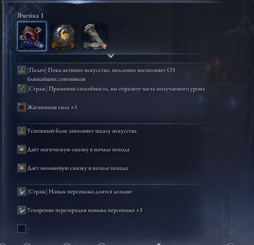 >>49952526 >Что поставить вместо него тогда? Можешь ситуативно талики на резисты разные ставить. Талисман когтя, если часто в прыжке бьешь. На урон от стрел если часто пушкой или луком пользуешься, но тм прибавка всего 10%. Еще пикрилы неплохие. В длс есть талик на урон оружием в двуручном хвате.