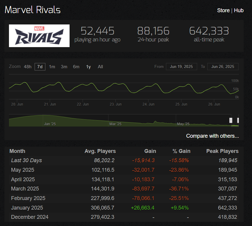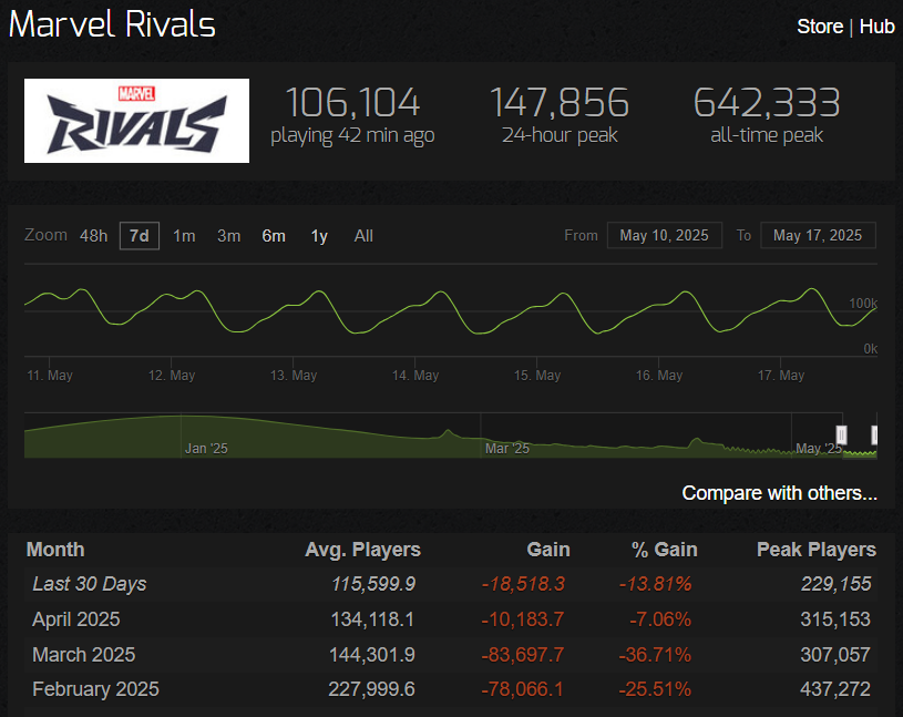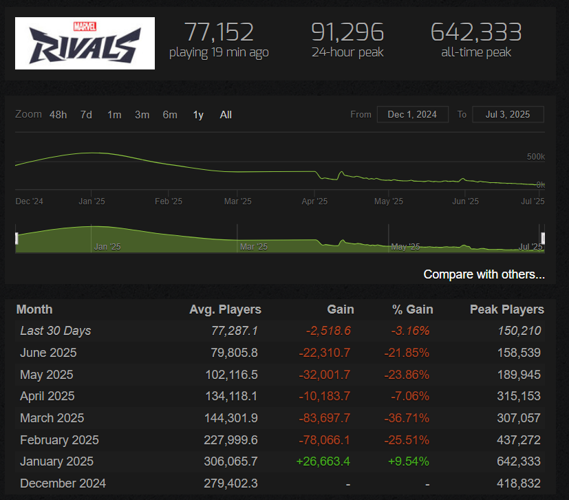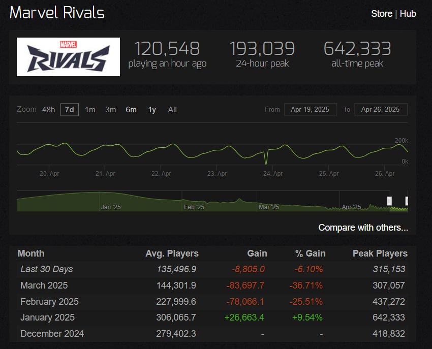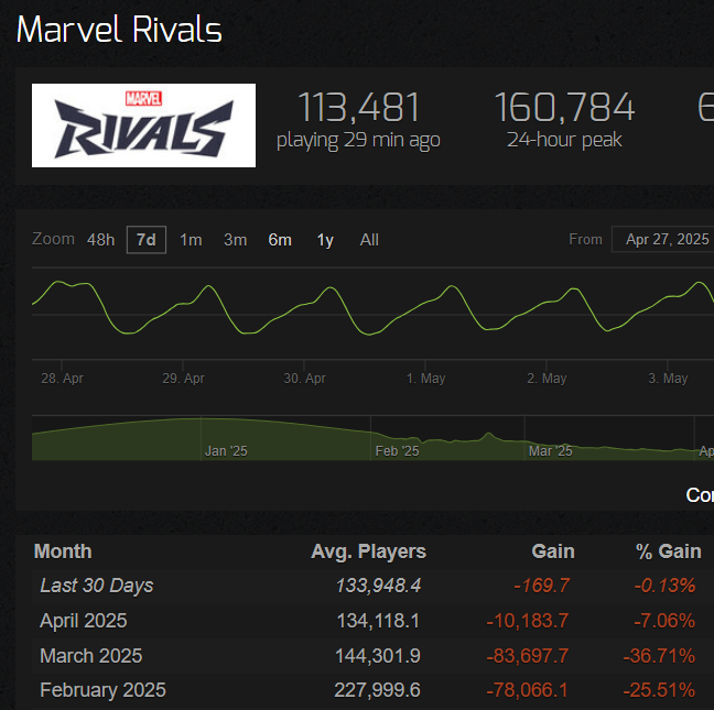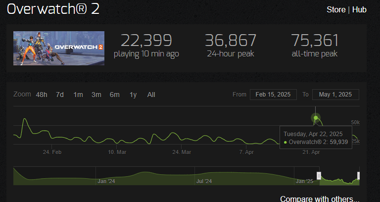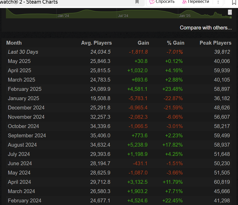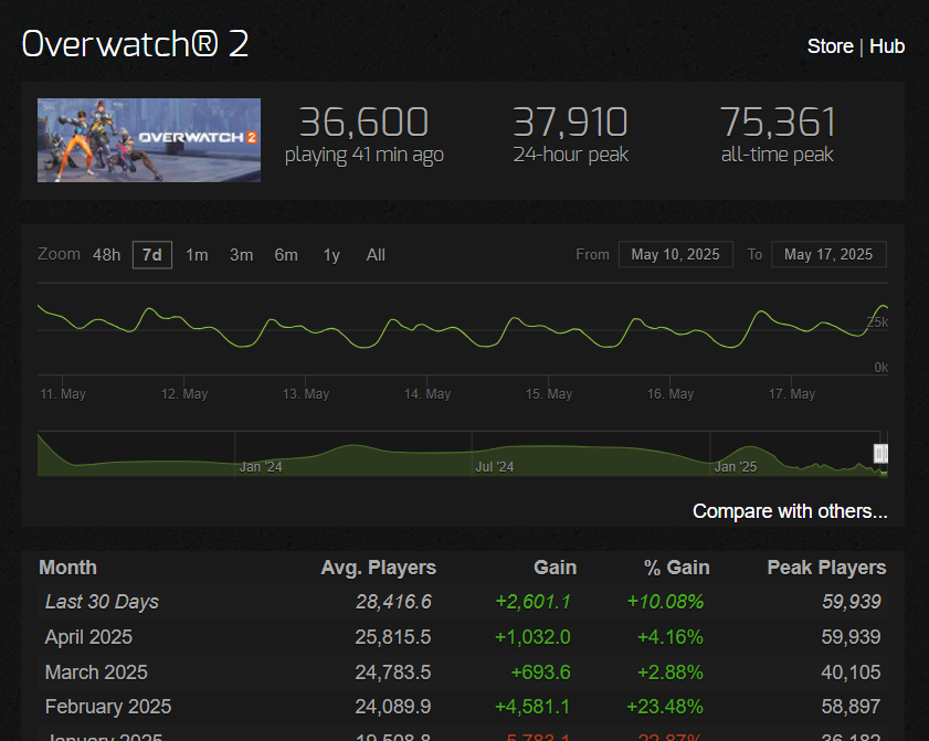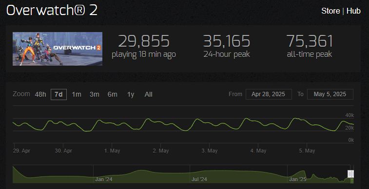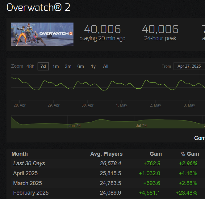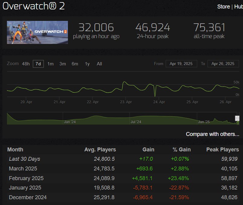 Я уверен, что, хотя скины overwatch хорошо продаются в расчете на одного игрока, количество игроков не растёт. До MR оно уже немного снижалось, а затем еще больше сократилось. Перки, а затем сезон на стадионе, привёл к некоторым скачкам, которые даже не позволили вернуть онлайн к среднему показателю за год до этого. Более того, эти всплески онлайна будут снижаться на протяжении всего сезона. В текущем новом сезоне такого скачка не было, и он уже ниже, чем в конце прошлого сезона, а ведь новый сезон только начался. И да, прежде чем кто-либо начнёт пиздеть, что это основано только на данных steamdb, я скажу пойти ему нахуй, т.к. нет причин ожидать, что база игроков в стиме будет следовать тенденциям, отличным от консолей и батленета.