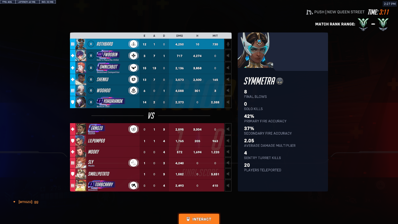 >>49791275 Берешь абилку на два раз Е, потом отхил. Я забегал на поинт или возле робота и носился прыжками и жал Е. Убить было сложно. >>49795662 Как раз выиграл тяжелый матч (4:3) против шлёндры. Там какой-то задрот был, по 13к дпс выдавал пока остальные по 6к в его тиме. На пике мой и его билды.