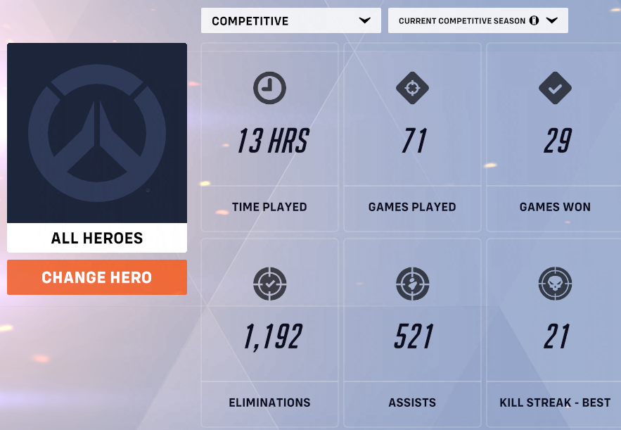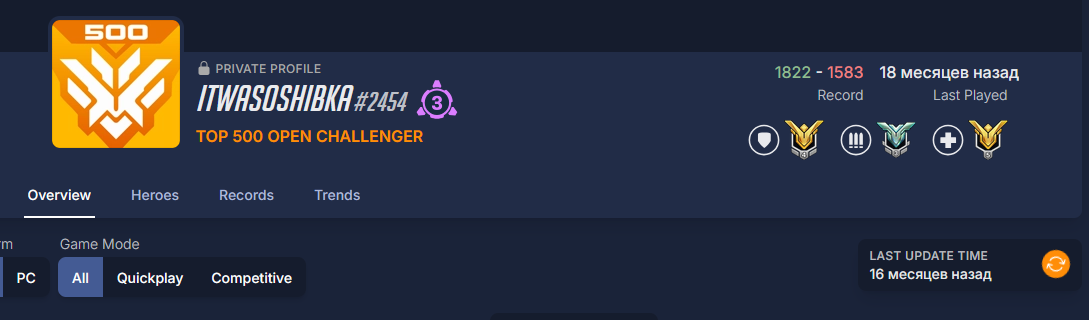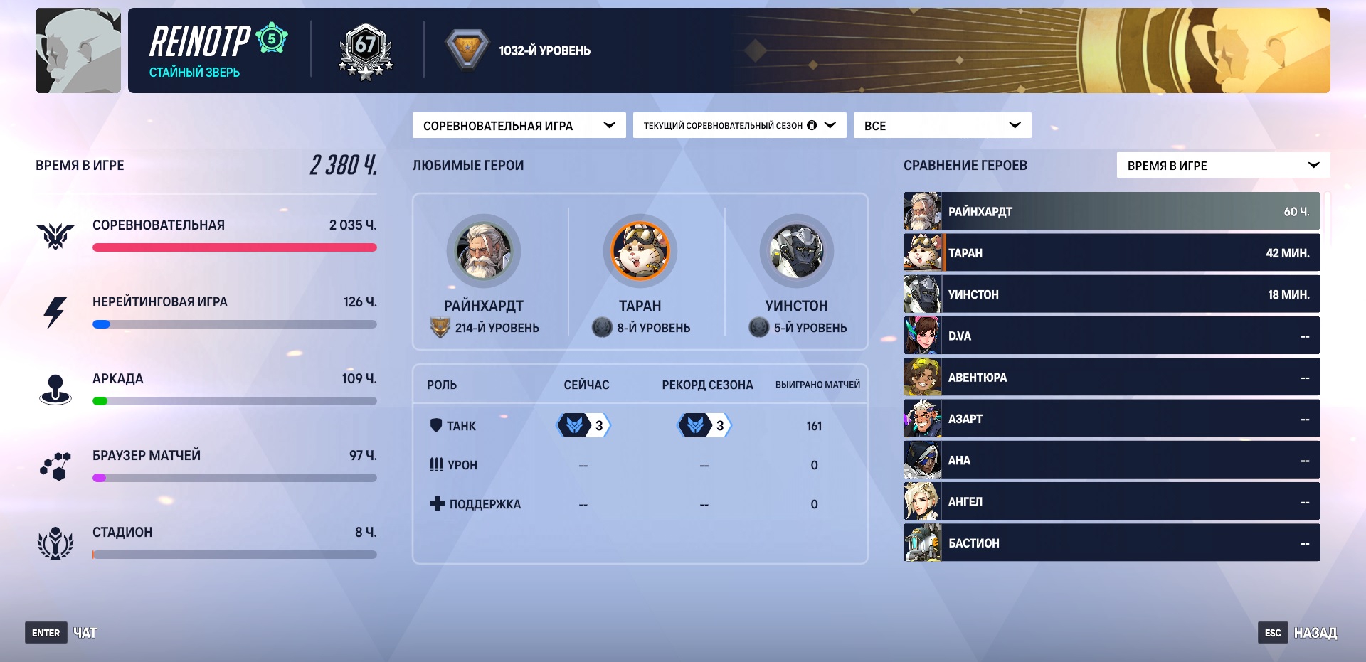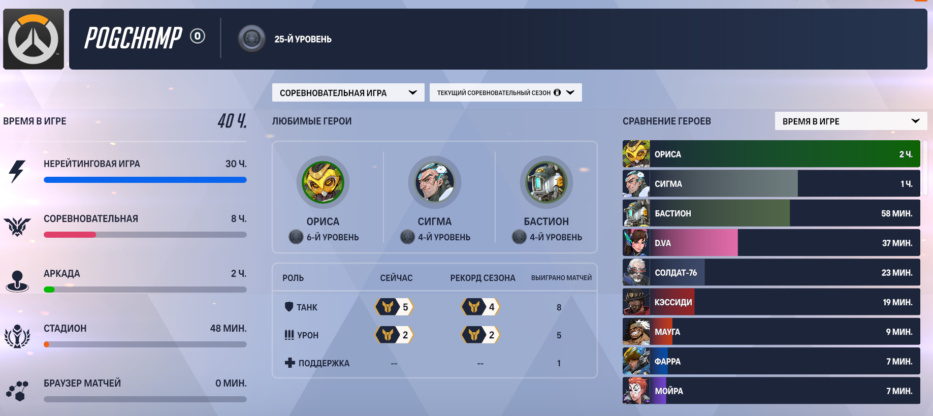 3) Рандомный третий акк который я забросил еще до выхода овервотч 2 юзался для экспериментов над персонажами. (хотя может я буду его юзать как эксперименты в Стадионе с ебанутыми прокачками чтобы не засирать стадион основного аккаунта...) - Почти 400 часов Есть еще один аккаунт но я уже забыл его таг и почту. Так же есть аккаунт на Нинтендо Свич и Плейстейшн 4, но лень смотреть сколько там наиграно.
